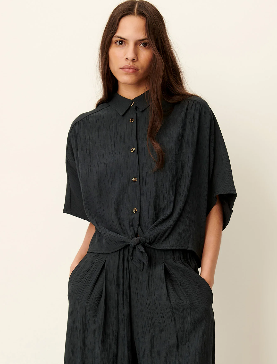 Cropped tie-front shirt made from soft stretch viscose seersucker crépon.