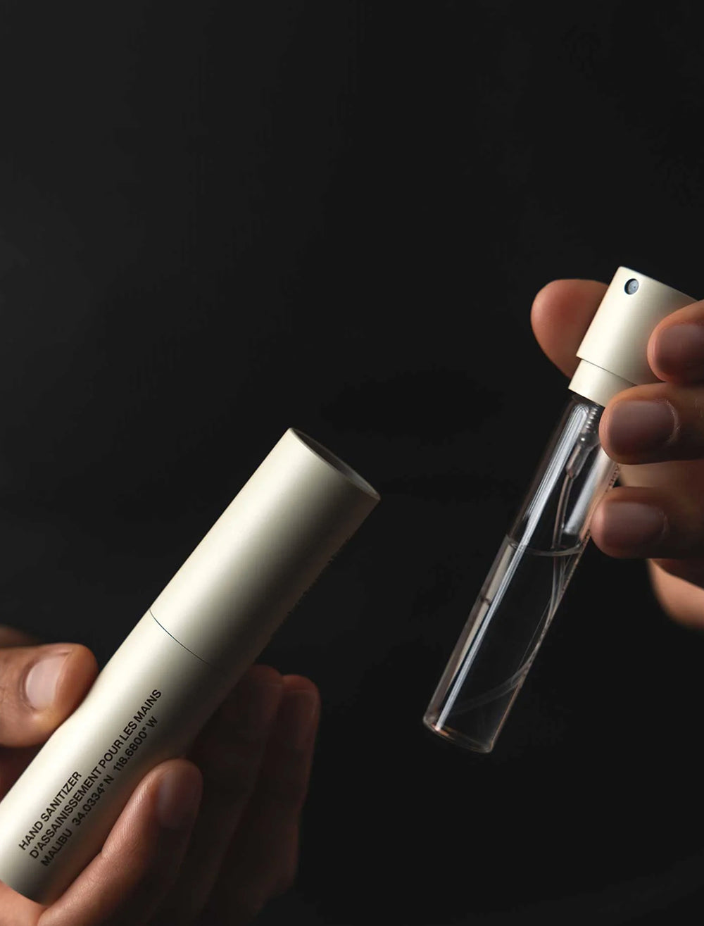 Evolvetogether's refillable hand sanitizer uses a plant-powered blend of hydrating glycerin, soothing aloe vera, naturally antimicrobial essential oils, and ethyl alcohol to eliminate 99.9% of the most common germs and bacteria* — all in a zero waste design and Malibu's light, citrusy scent.