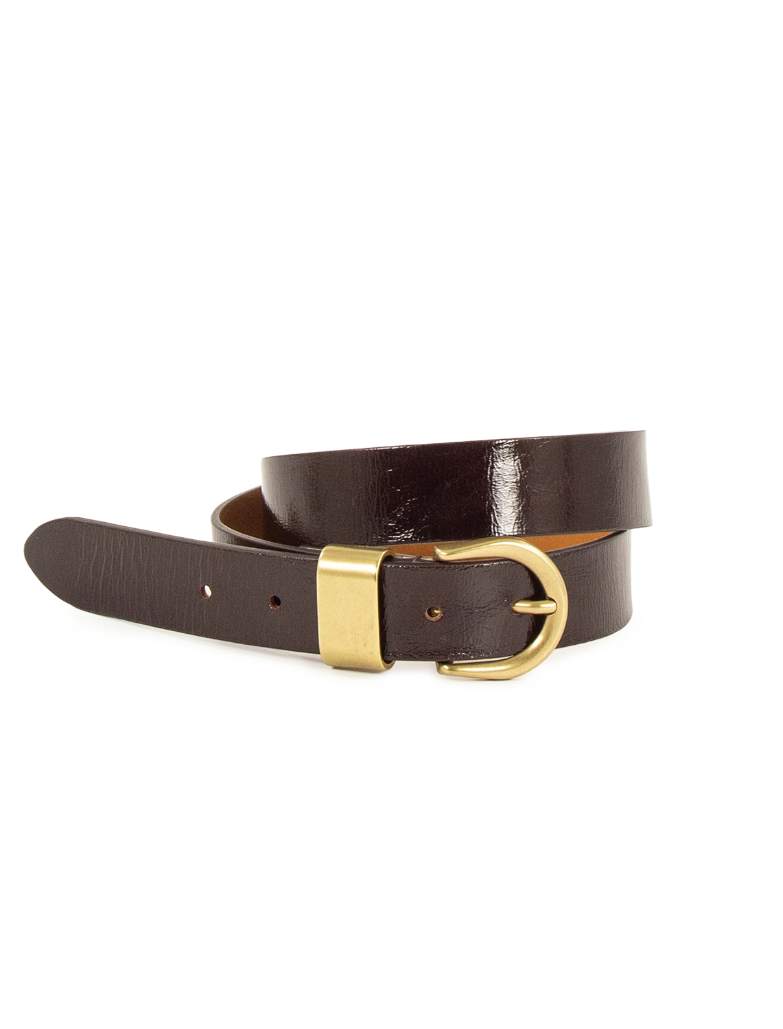 Patent cow leather belt with engraved buckle and metal belt loop.