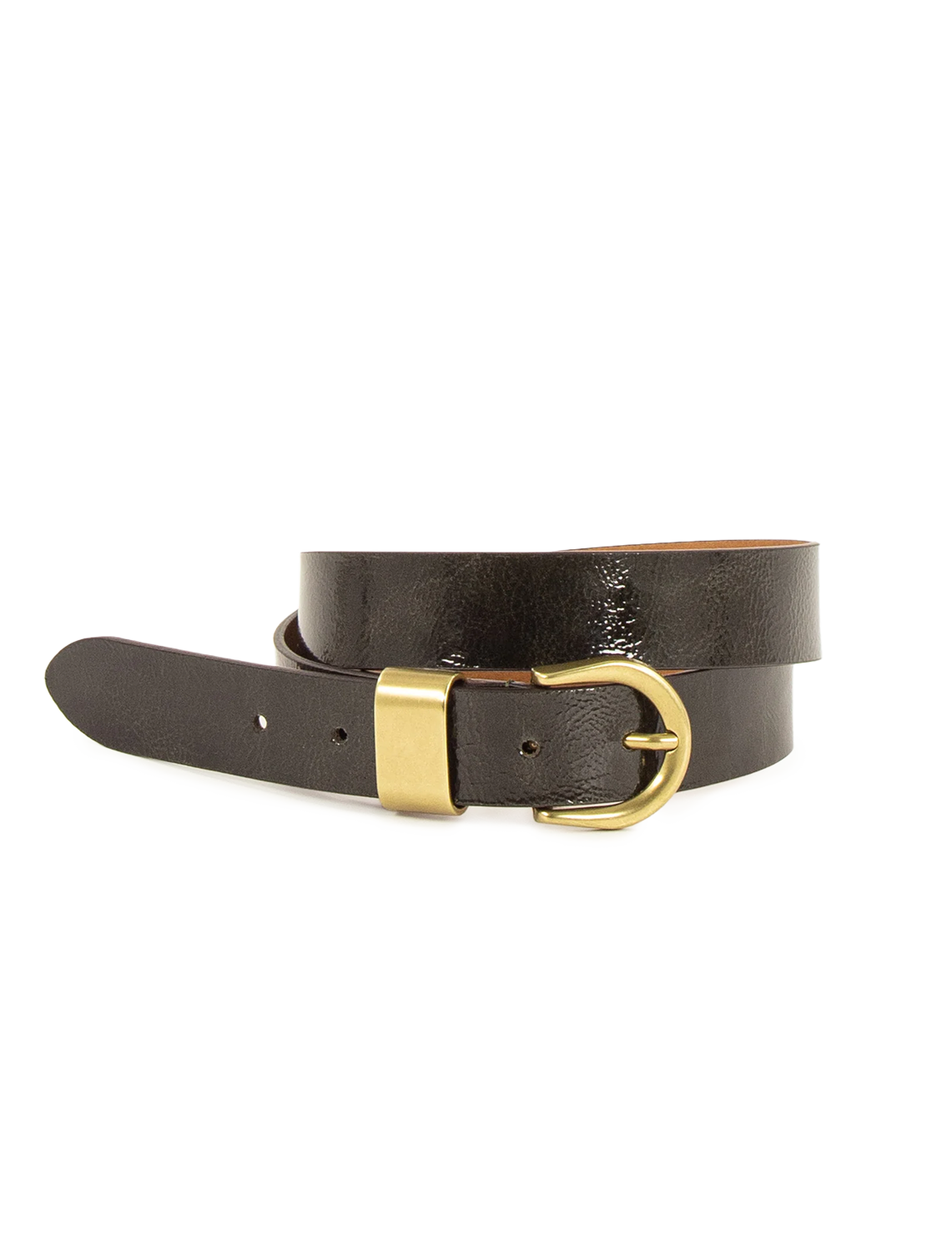 Patent cow leather belt with engraved buckle and metal belt loop.