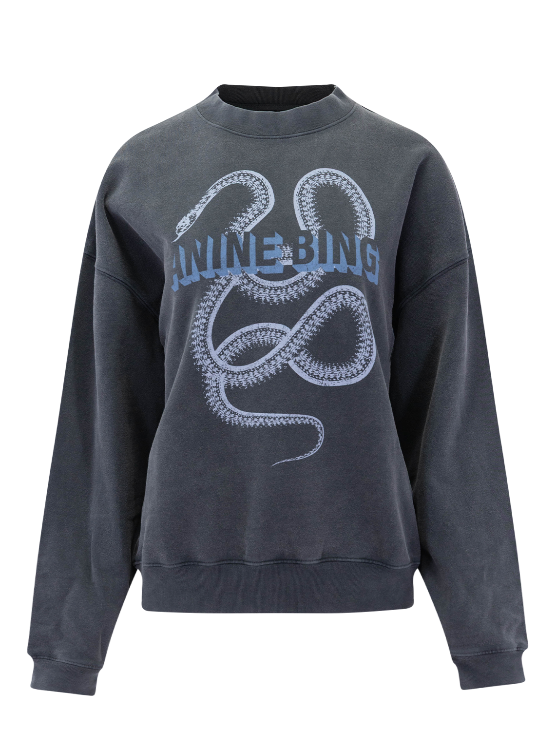 The Harvey Crew Sweatshirt is an oversized sweatshirt made from midweight 100% cotton fleece in washed black. It features a snake graphic intertwined with an ANINE BING logo.
