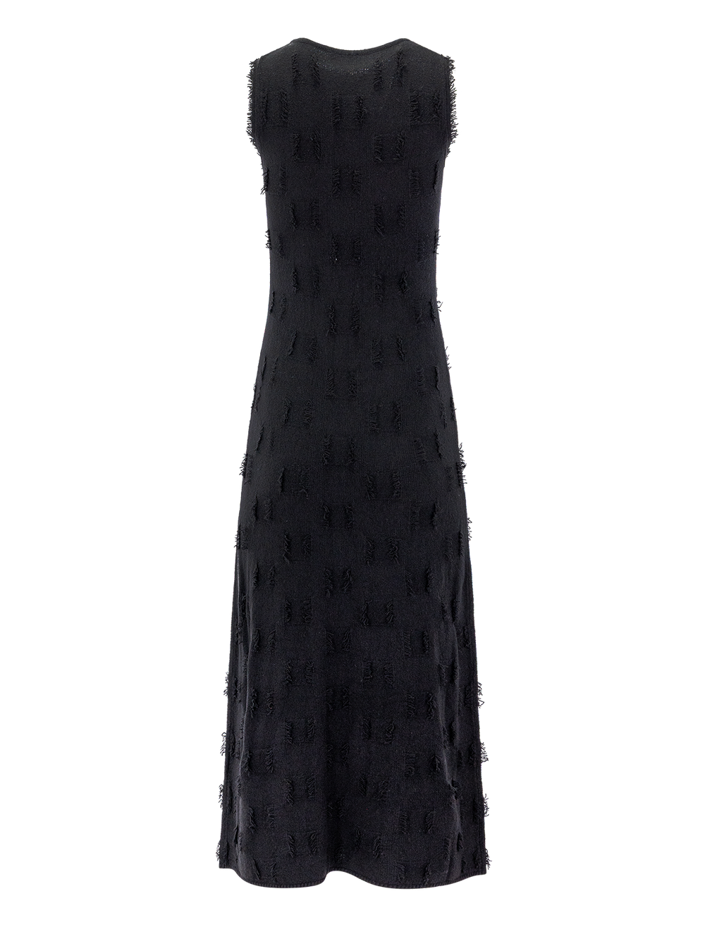 The Trivento is a sleeveless maxi dress featuring a flattering A-line fit. Its fitted bodice and soft, fine-gauge fringe create a beautiful textured look throughout.