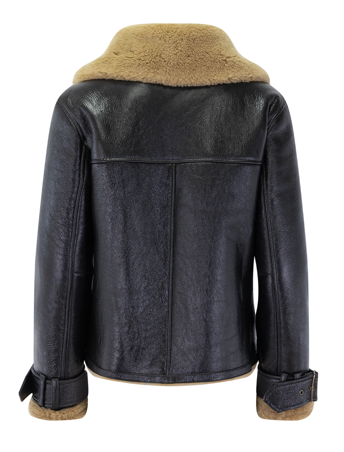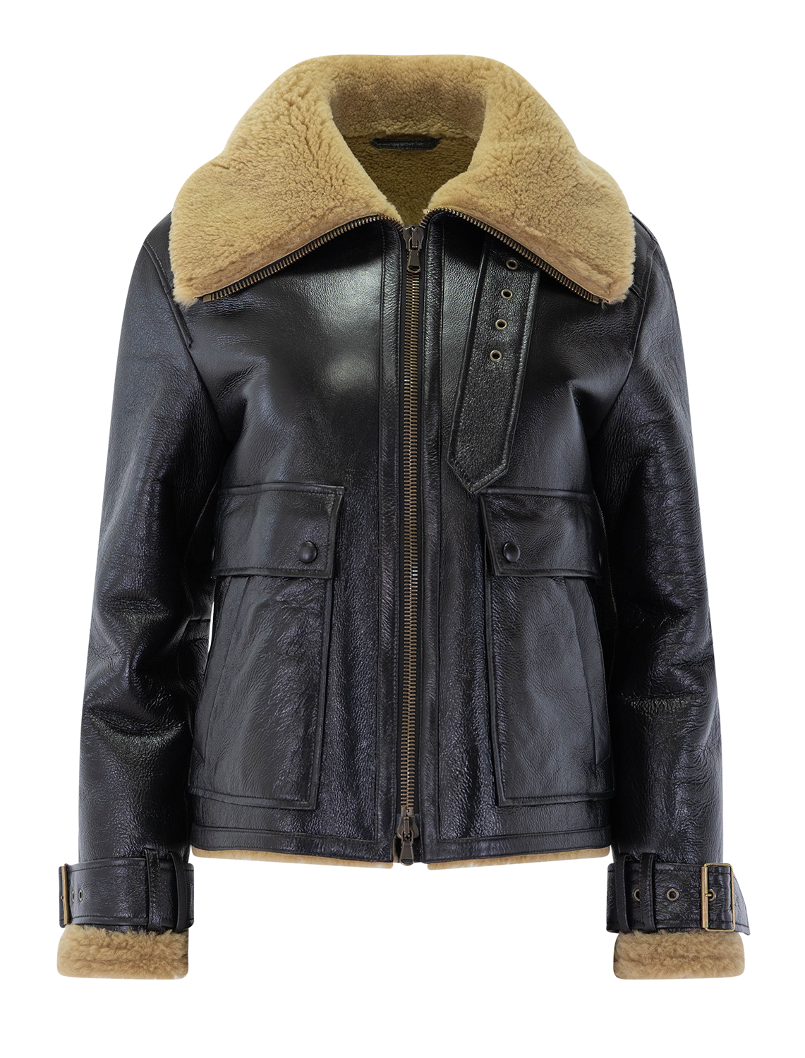 The sleekest way to stay warm. Crafted from 100% lambskin with a shiny, crackled finish and soft beige shearling lining, the Danika is a cold-weather take on the black leather jacket. Cut with a cropped, swing-back silhouette, it features a funnel neck collar with an adjustable neck tab and buckle, front double-entry flap pockets, a buckled sleeve tab, and a two-way zipper for ease. Layer over any of your cold-weather looks for a chic finish
