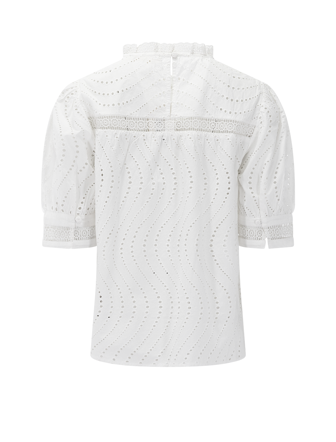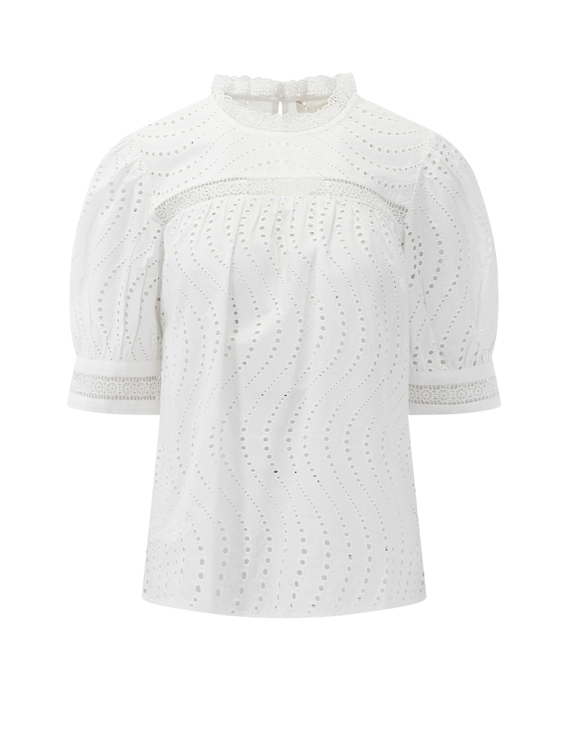 The Virginia Blouse elegantly reveals and conceals with degradé eyelets that undulate across soft water-washed poplin. A signature Ulla Johnson silhouette, this Pristine white top is framed by artfully puffed sleeves and is finished with intricate lace trims.