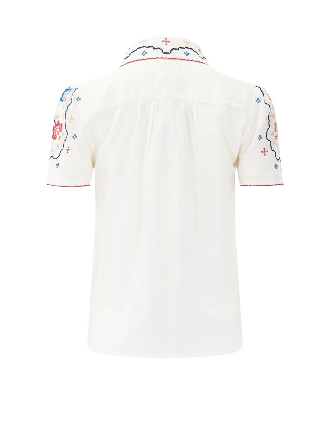 Elevate your everyday wardrobe with this charming M.A.B.E blouse, a timeless piece that effortlessly blends vintage-inspired details with modern comfort. The soft ecru cotton canvas features delicate cross-stitch embroidery in ruby and blue tones, creating a sophisticated focal point that works beautifully with everything from denim to tailored trousers. With its relaxed silhouette, Peter Pan collar, mother-of-pearl buttons, and delicate crochet lace trim, this blouse captures understated elegance and pairs seamlessly with your existing wardrobe.