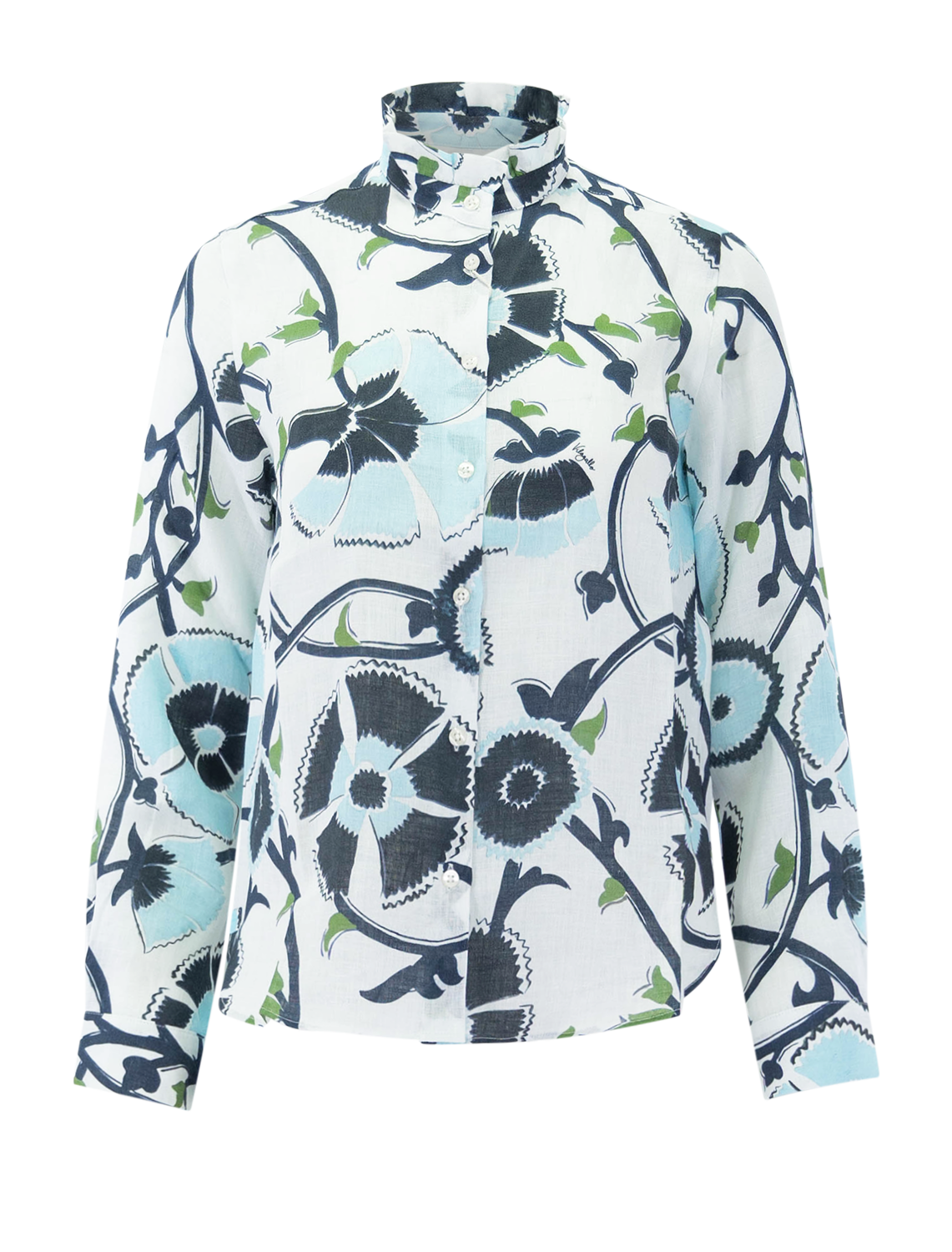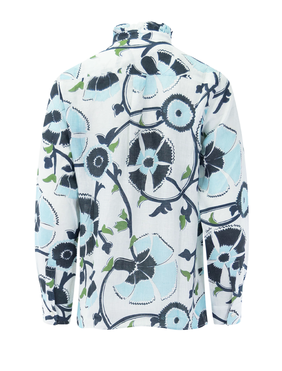 Floral print shirt in shades of blue. Features a ruffled collar, button closure, and long sleeves with cuffs.