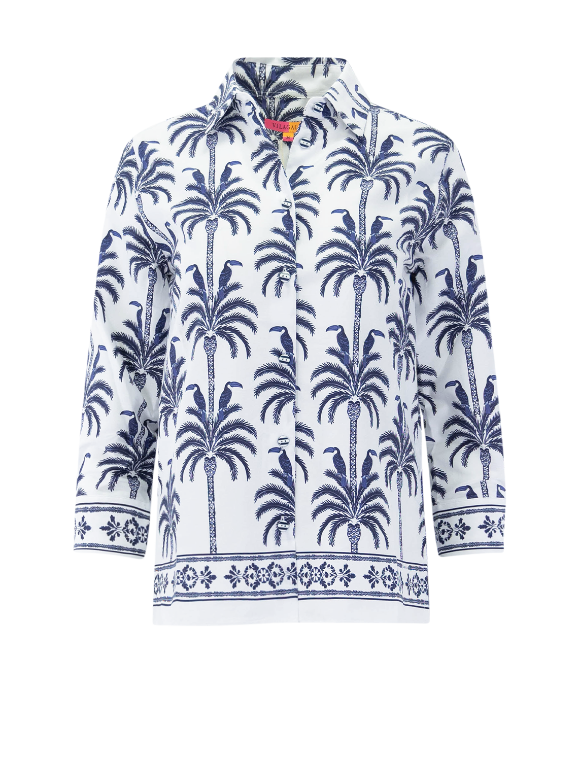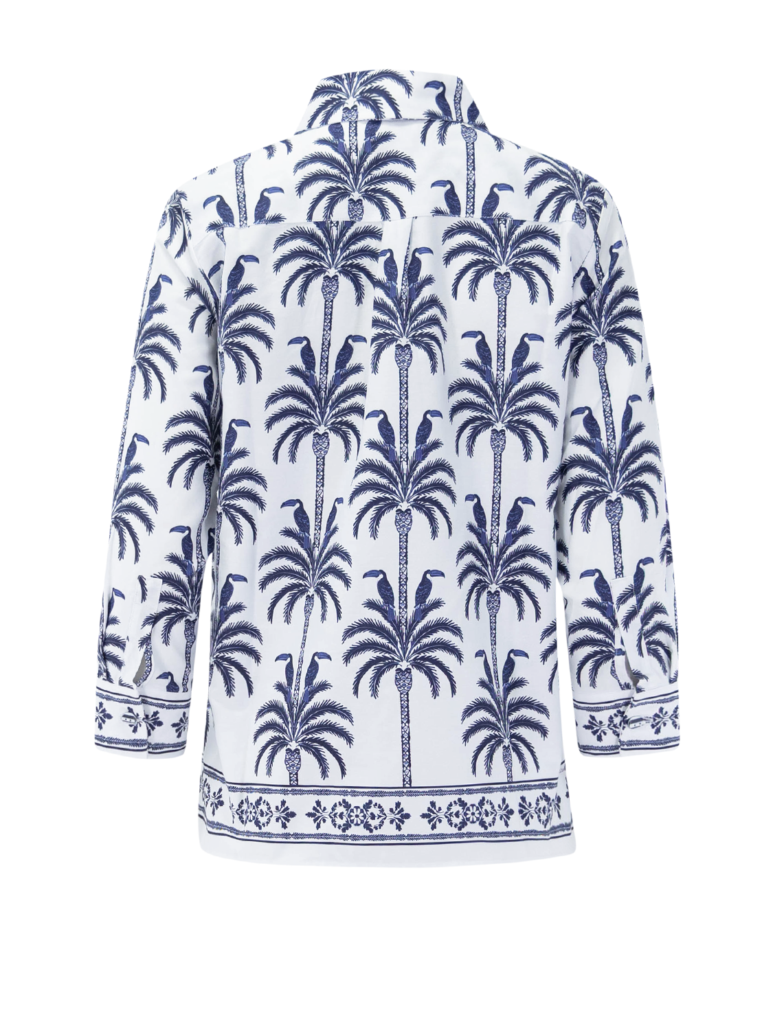 White shirt with an all-over print of toucans and palm trees in navy blue. Shirt collar, button-front closure, and long sleeves. Decorative trim in a matching tone at the hem. Straight cut.