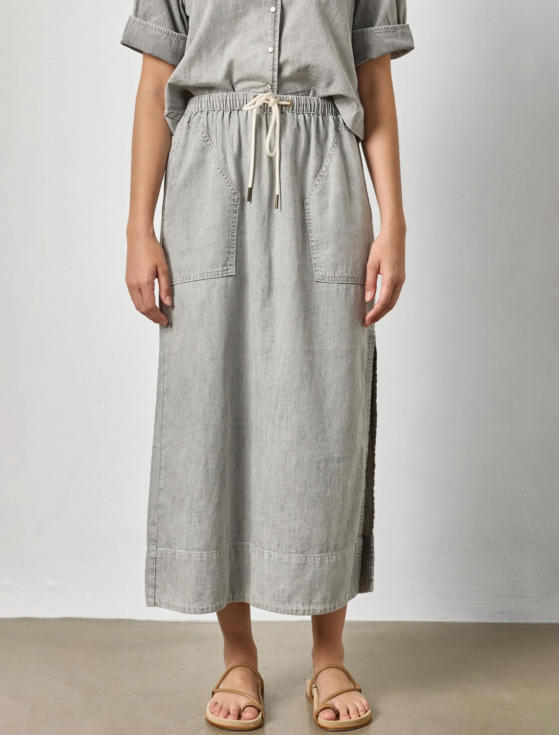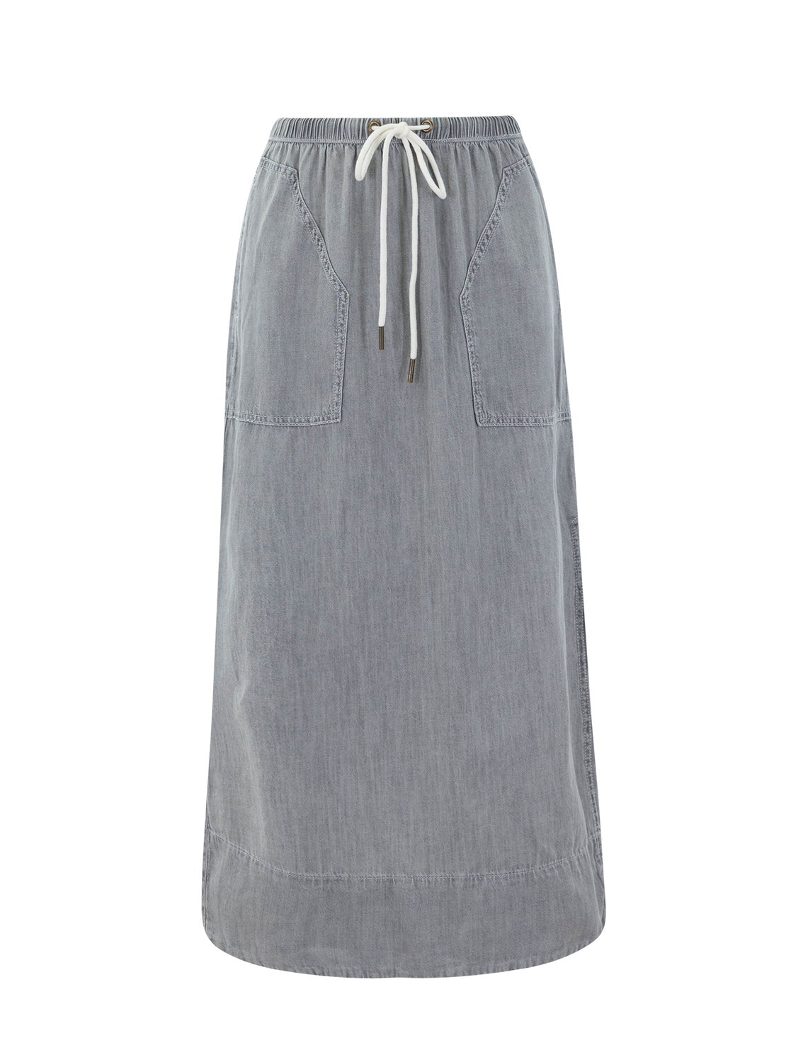 Lilla P.'s Denim Drawcord Skirt brings ease and versatility to your spring wardrobe. Designed in the brand's lightweight 100% cotton denim, this skirt features front top-applied pockets, an elastic waistband, and a functional drawcord for all-day comfort. A side slit adds movement and a flattering touch, making it an effortless option for everyday wear.