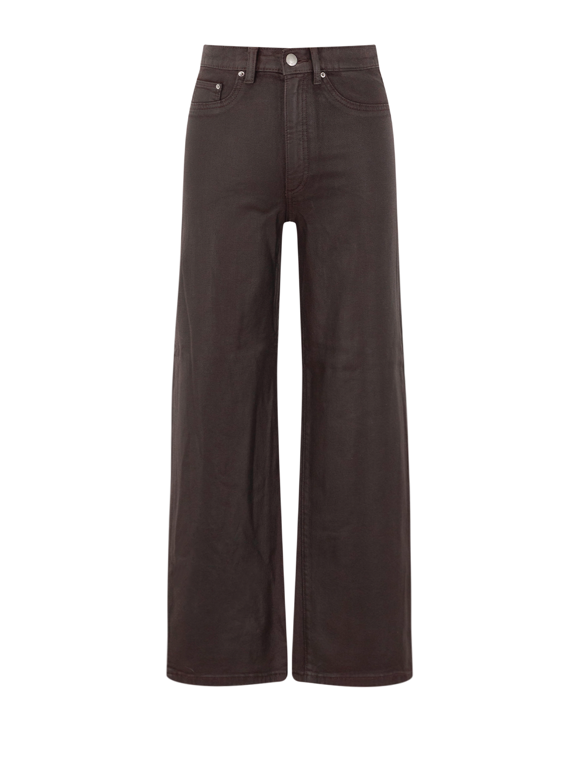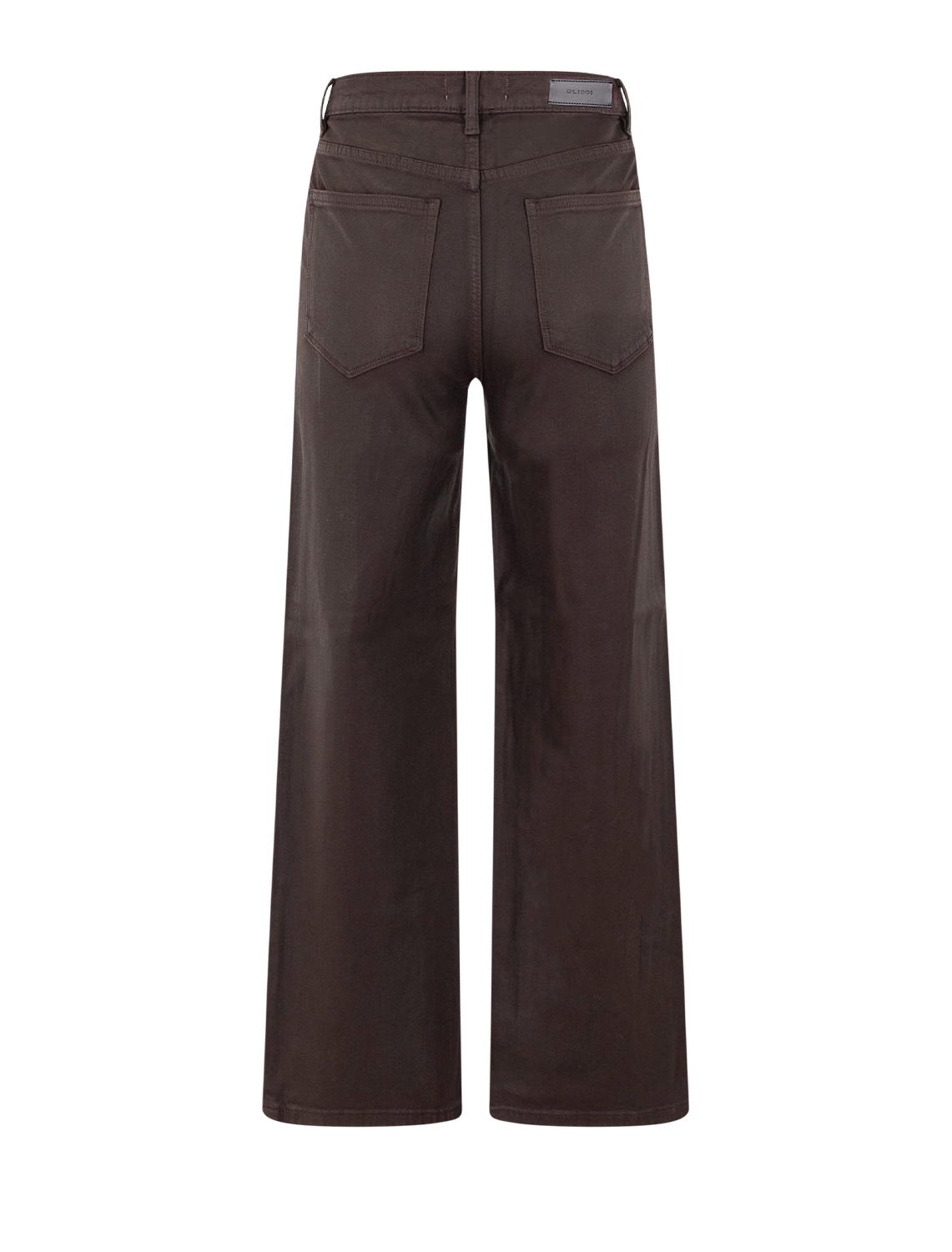 Karmine is a high rise refined wide leg with a 28" inseam for an easy and relaxed fit. Fig is a light, muted red coated denim with a purple undertone. It features gold hardware, tonal stitching, a clean hem and a black back patch.