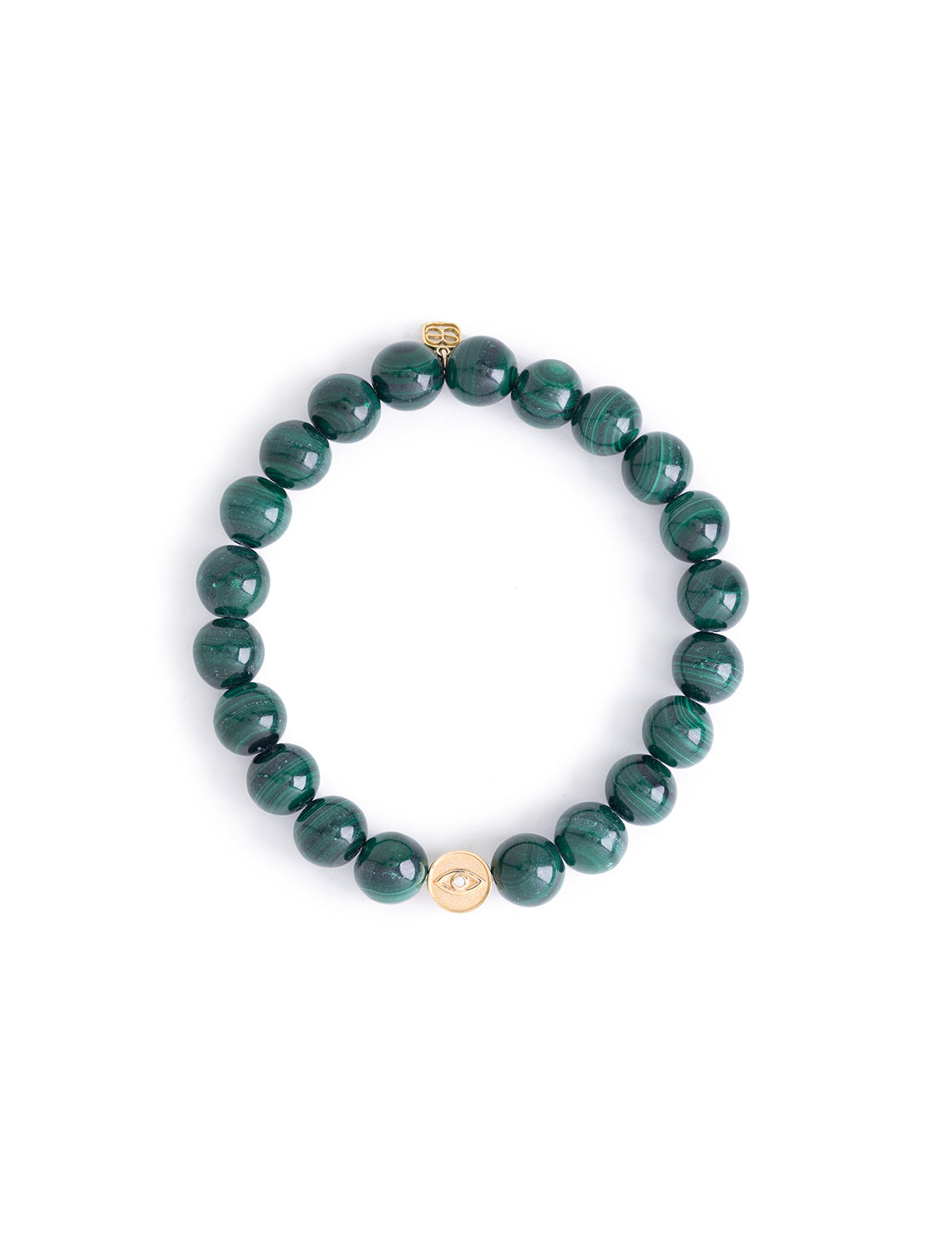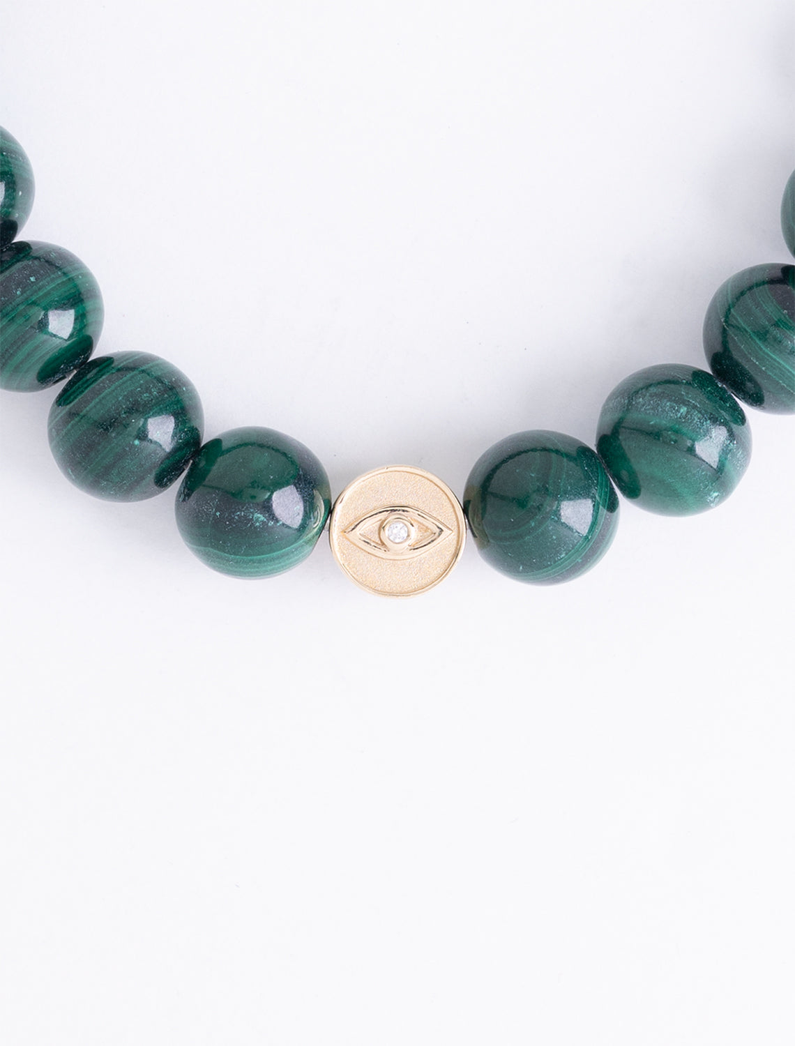Sydney Evan's diamond and gold luck and protection bead on malachite beaded bracelet.