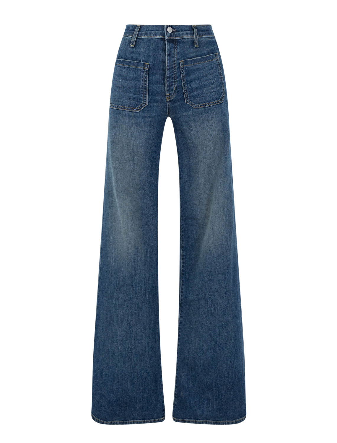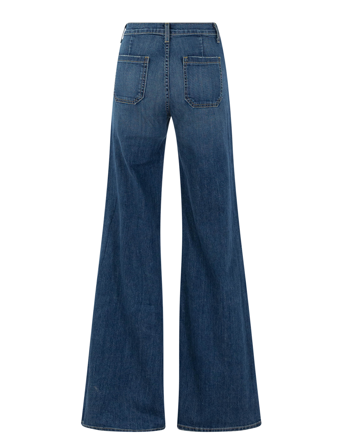 High-rise slim flare leg jean in Japanese stretch denim. Fitted through hips. Front and back top stitched patch pockets. Zip fly. Shank closure. Belt loops.