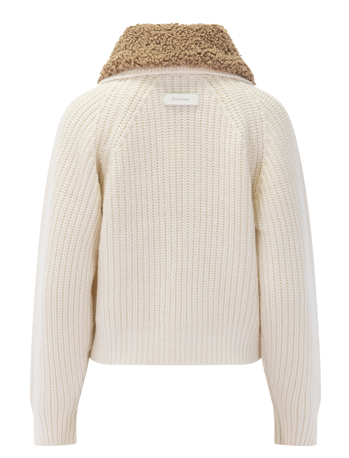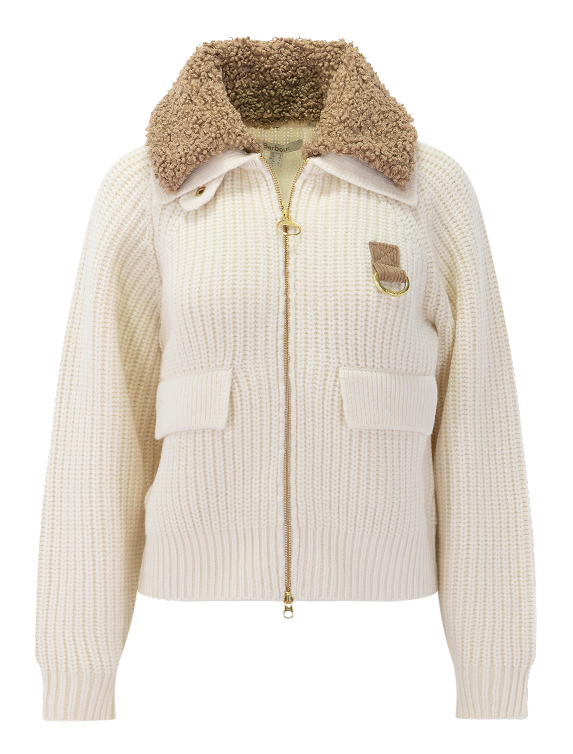 Cozy meets contemporary with the Barbour Marla Knitted Bomber Jacket. Crafted from a chunky wool blend, this bomber features a detachable sherpa collar for extra versatility. Fisherman rib detailing, raglan sleeves, and side entry pockets add function and flair, while the D-ring accent and iconic Barbour PU patch at the back neck complete the modern, stylish look.