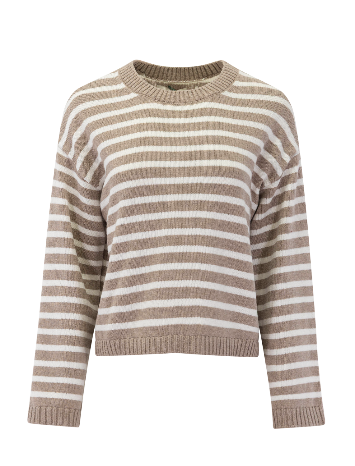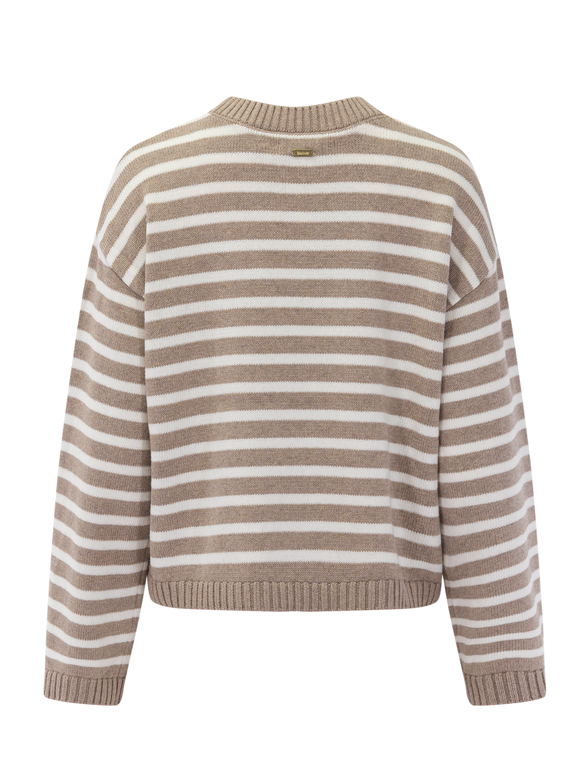 The Barbour Rosie Knitted Crew-Neck Jumper is a relaxed-fit knit crafted from a soft cotton-cashmere blend. Featuring an all-over stripe design, dropped shoulders and straight sleeves, it offers effortless style and comfort. Finished with a Barbour slim metal ID bar at the back neck.