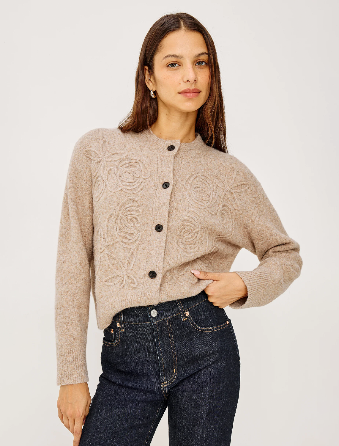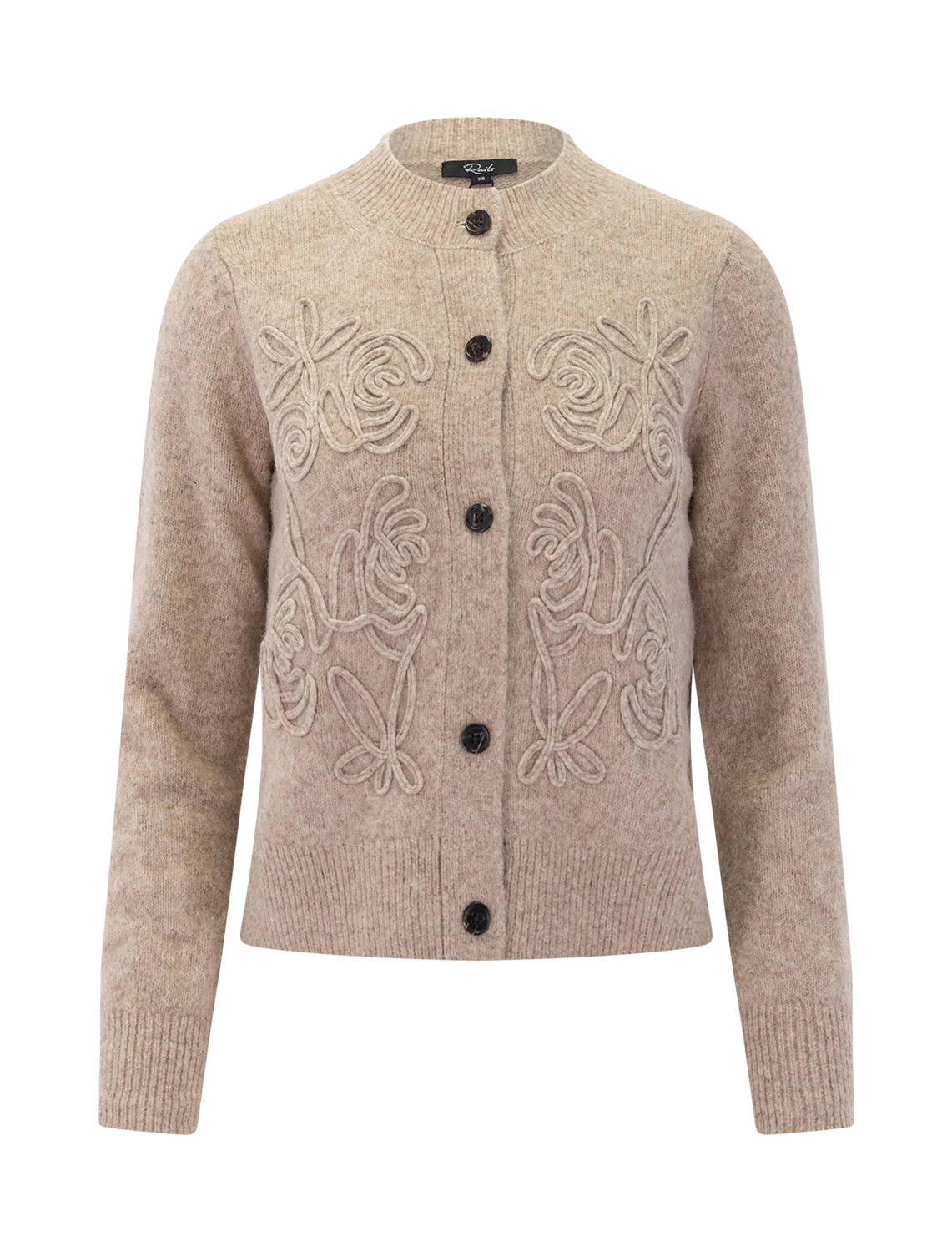 Comfort elevated to an art form, the Coralee is a sumptuously soft alpaca-knit cardigan with romantic soutache rosette detailing. It features front button closures, a relaxed fit, and long sleeves.