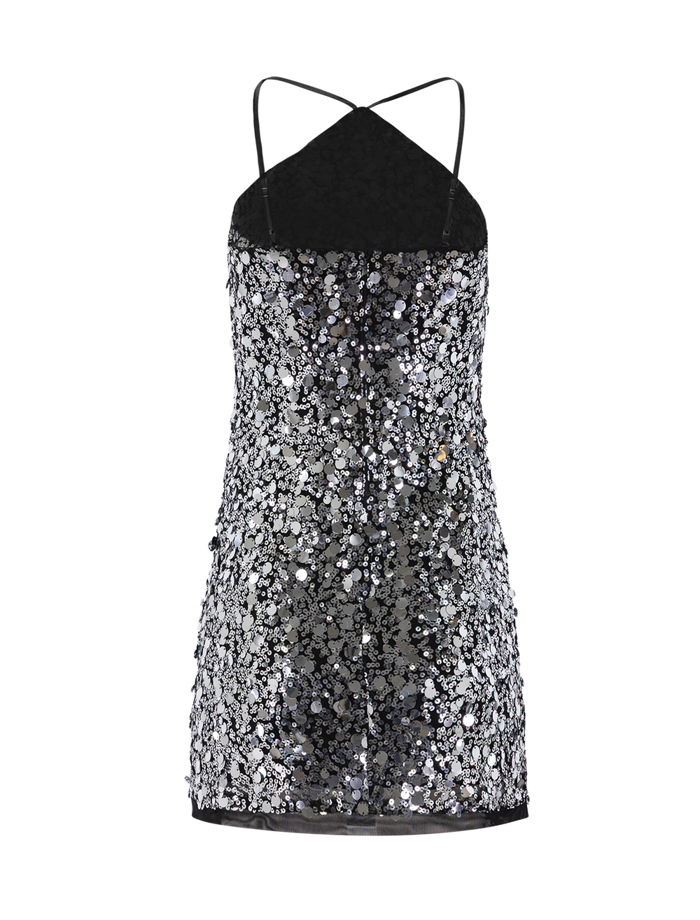 You'll be ready to make a statement on your next special occasion with this mini-length halter dress covered in shimmering sequins.