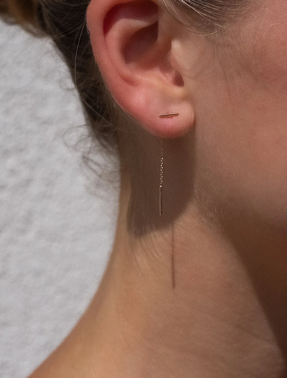 These threaders feature a simple gold bar in the front with a drop down bar and chain that threads through and falls behind the ear. A unique addition to your ear stack.