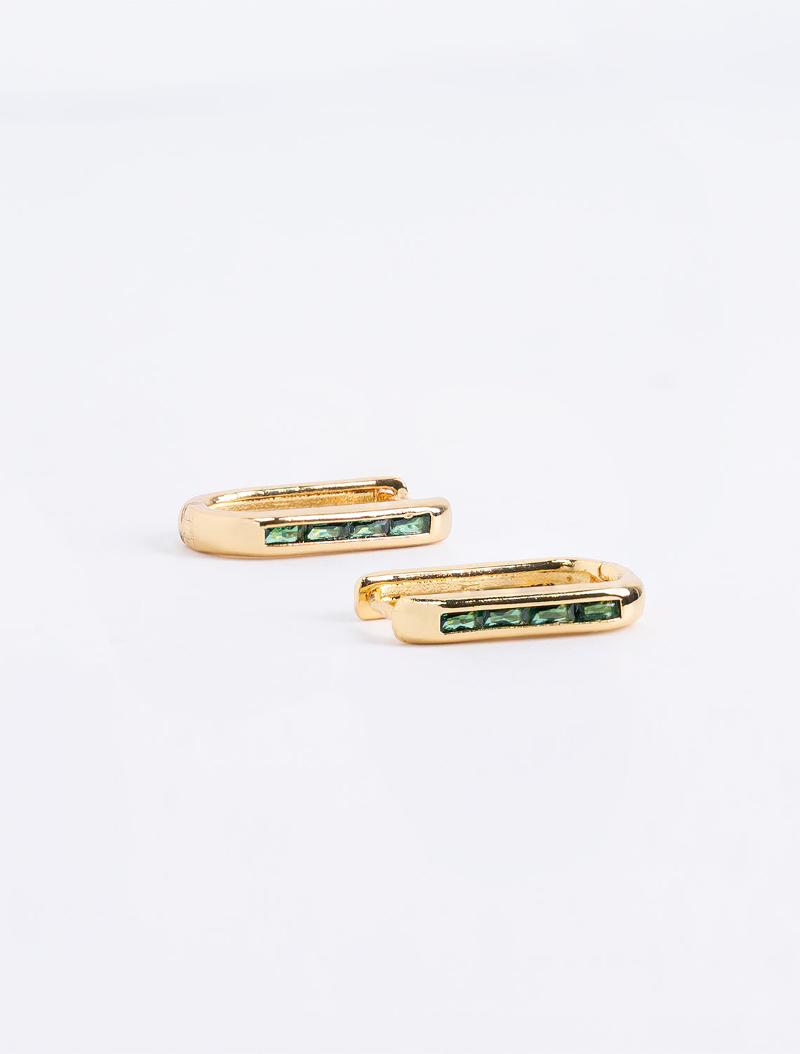 A modern take on classic sparkle. These gold huggies feature a row of baguette-cut stones that catch the light with every turn. Available in emerald, sapphire, and clear, they bring a vibrant yet timeless touch to your everyday look. Perfect for stacking or making a subtle statement on their own.