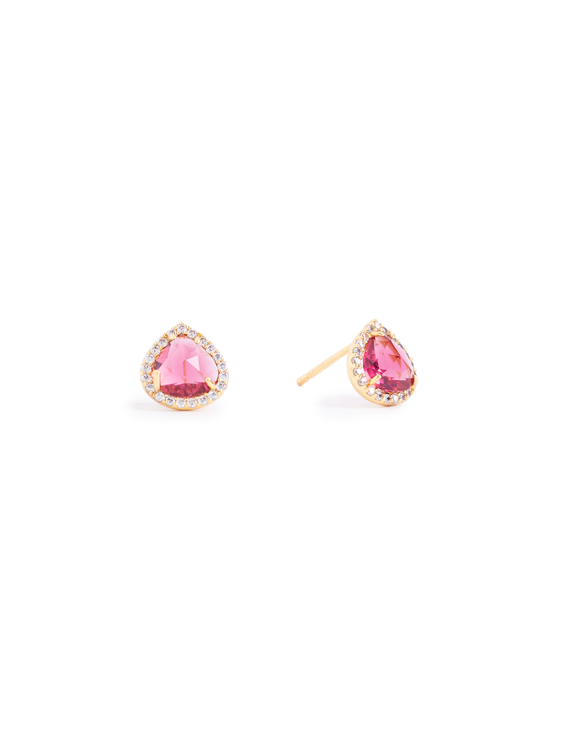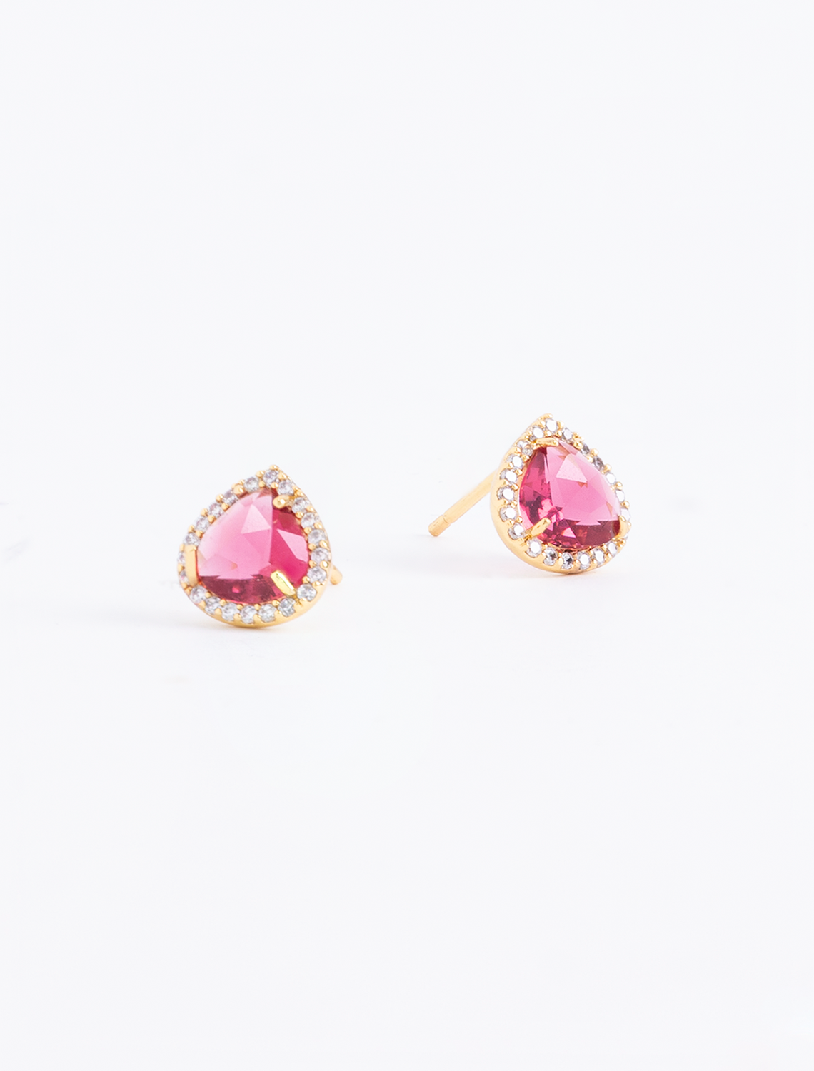 These elegant stud earrings from TAI feature a beautiful pink/red glass pear-shaped stone set in a gold-tone bezel. The classic design and vibrant color make them a timeless and versatile accessory. Perfect for everyday wear or special occasions.