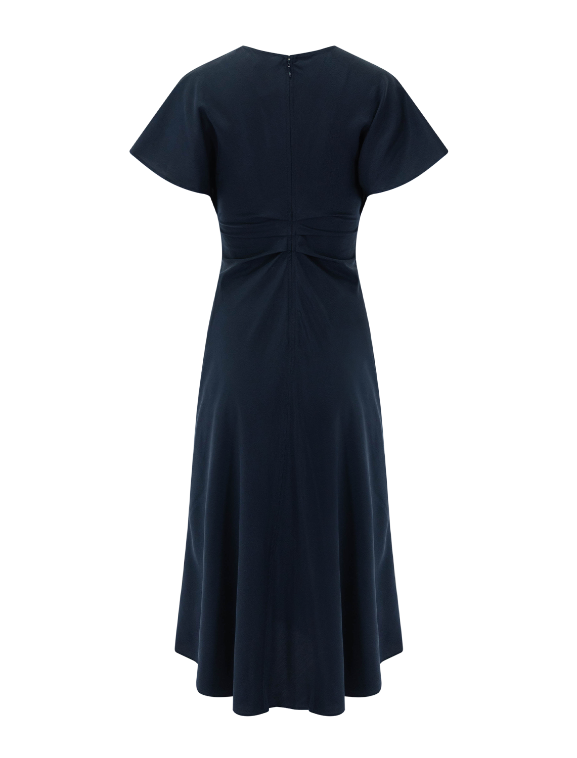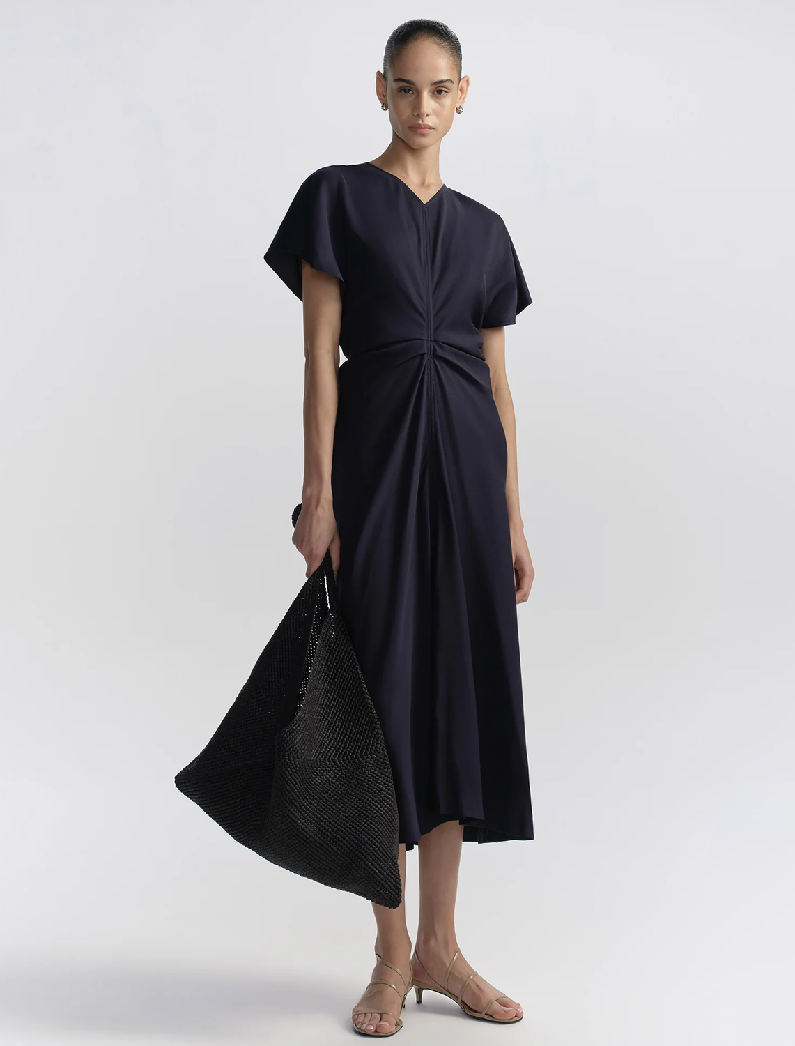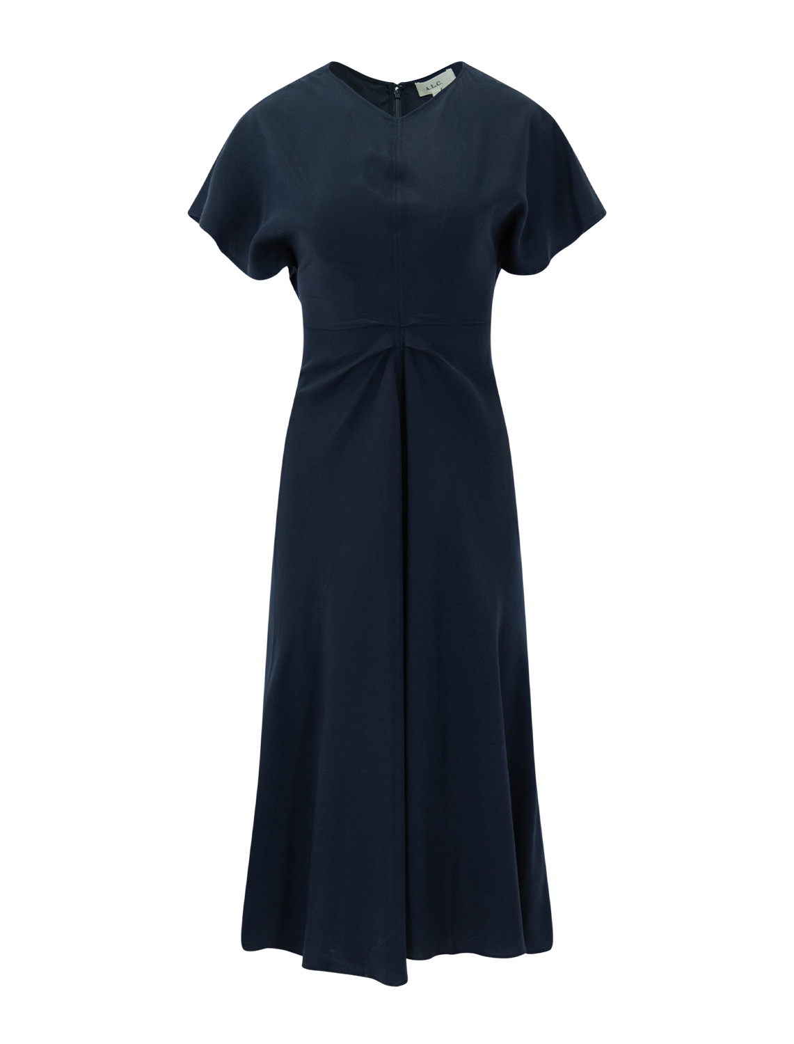 The Rem Dress is crafted from lyocell twill in a night blue hue. This midi silhouette features soft cap sleeves and a gathered waist detail that creates fluid drape and shape.
