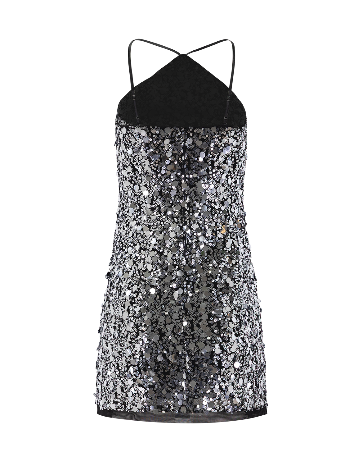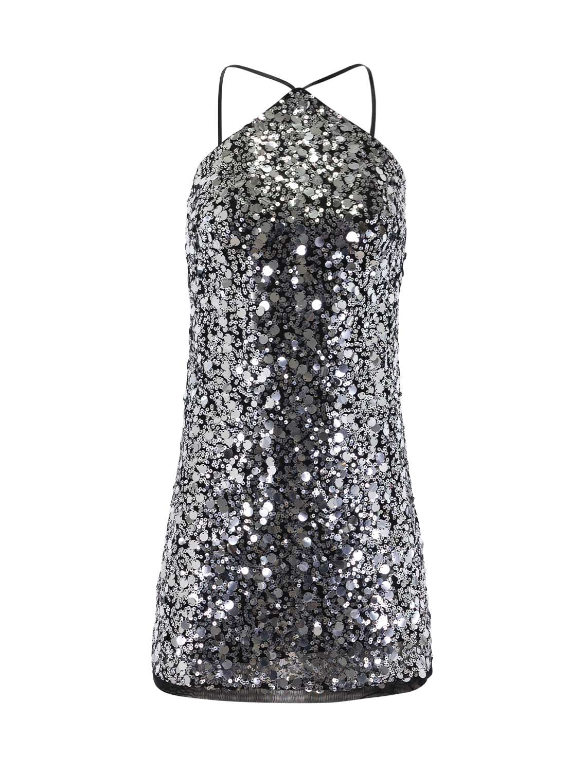 You'll be ready to make a statement on your next special occasion with this mini-length halter dress covered in shimmering sequins.