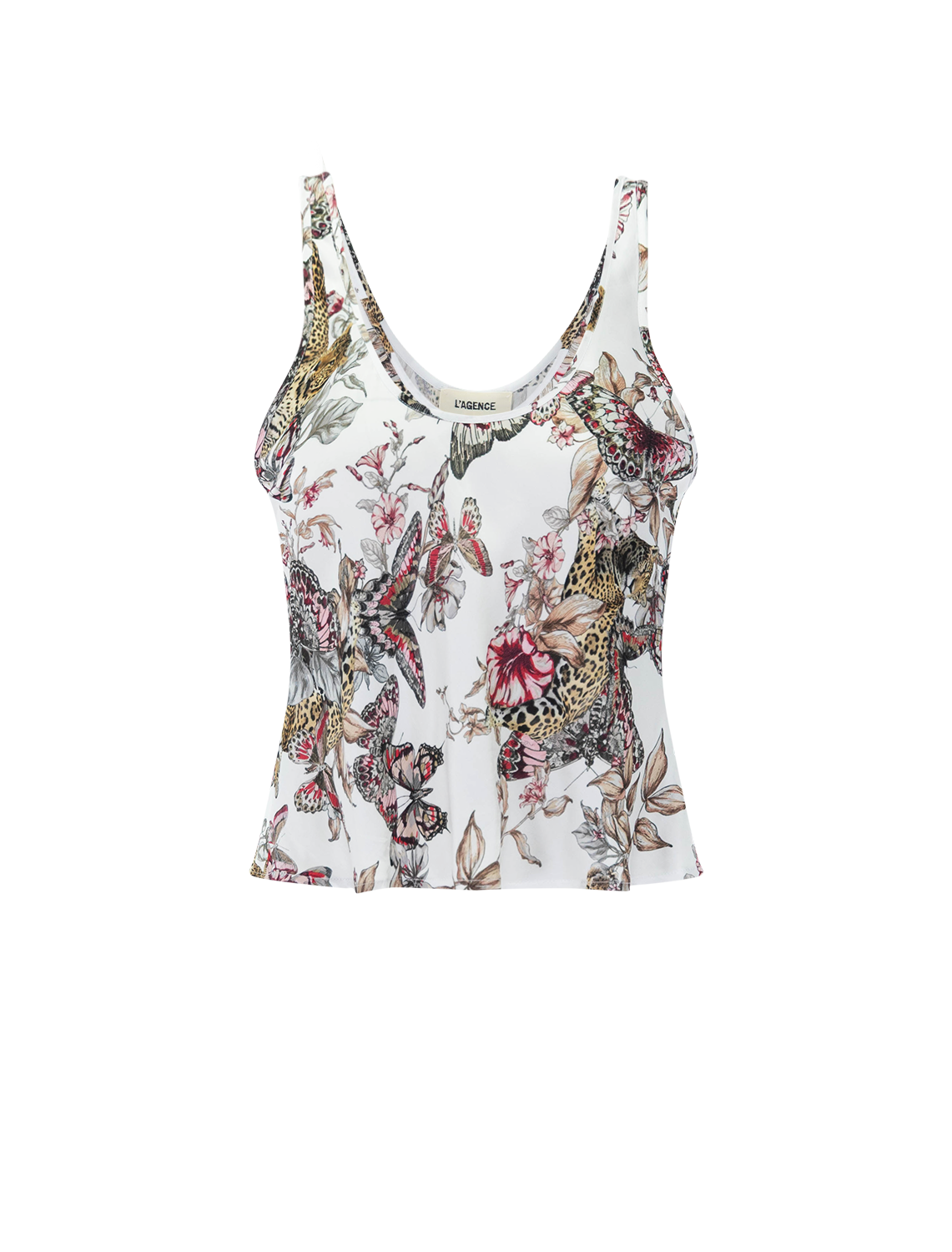 L'Agence's newest tank, the Eddie tank is an easy essential, elevated. Cut on the bias for a flattering drape, it skims the body without clinging. Finished with a soft scoop neckline and vibrant print, it transitions from day to night effortlessly.