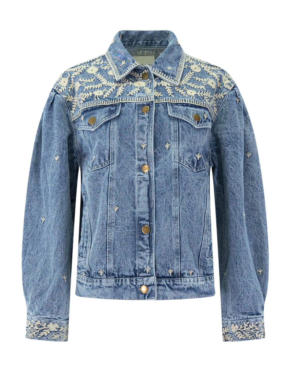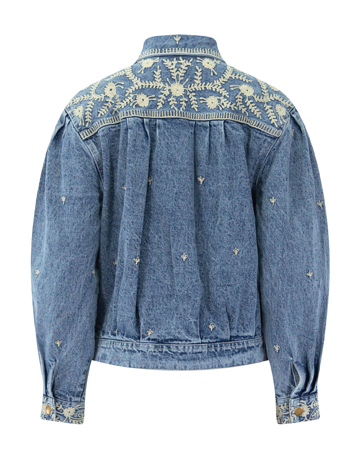 Denim jacket in sturdy yet supple denim. Features a button-front closure and two side pockets. Slightly puffed sleeves with embroidered cuffs. Structured but relaxed fit that sits comfortably on the shoulders with ease of movement. Lived-in feel from the first wear.