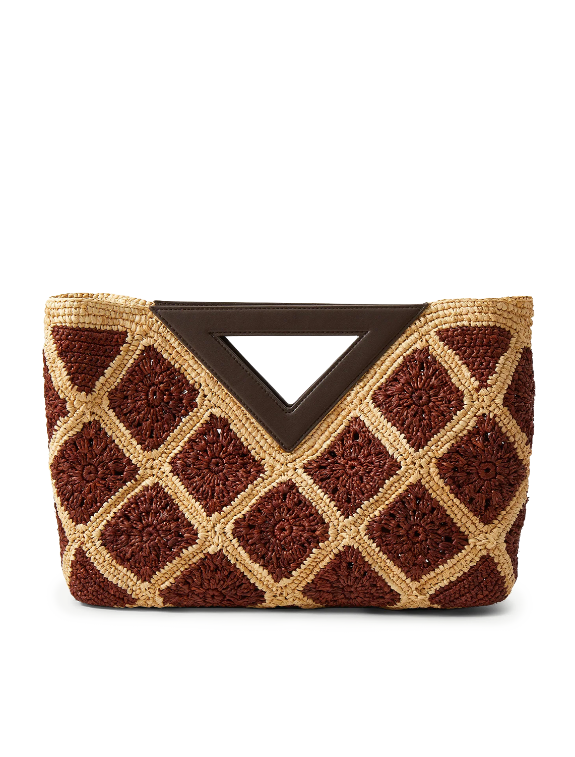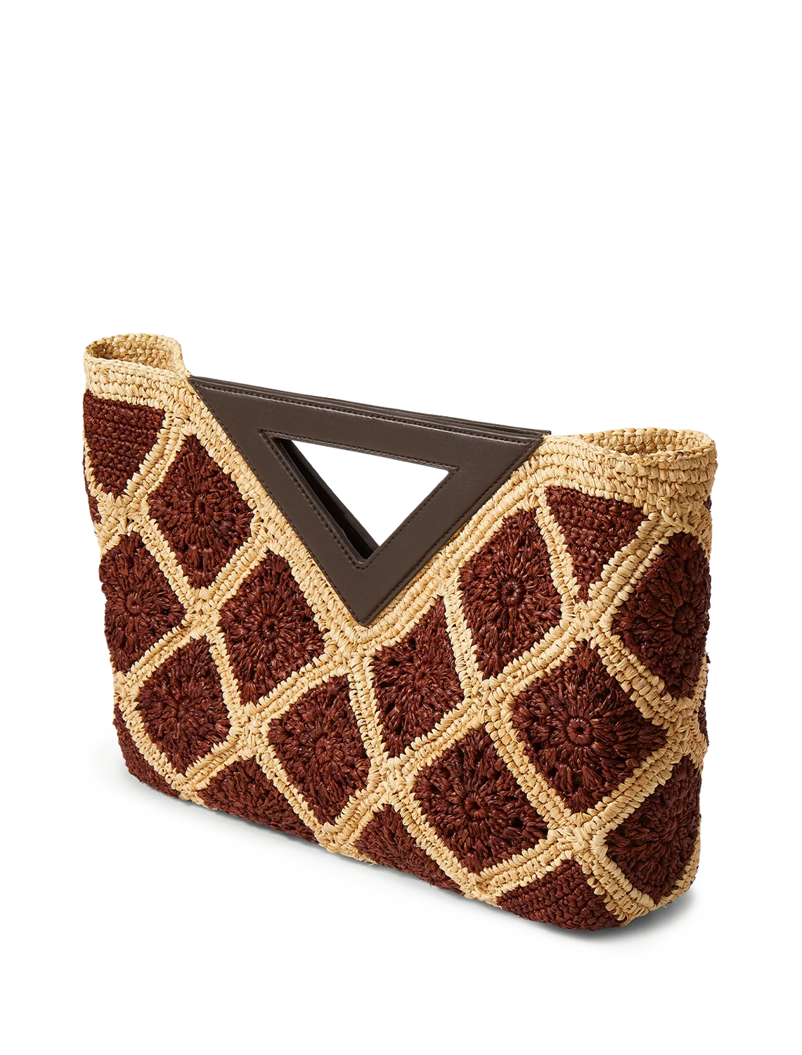 The bag you’ll reach for on sunny days and getaways. Crafted from natural raffia, the Vesper clutch features an oversized body, crocheted with a natural-and-brown geometric pattern. A dark brown leather V-shaped handle—a subtle nod to the brand—allows for easy carrying. Finished with a magnetic snap closure, it comfortably fits all your essentials.
