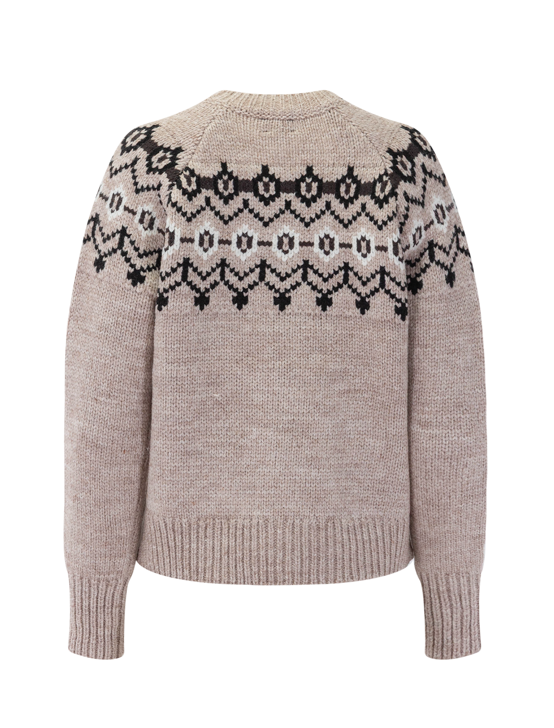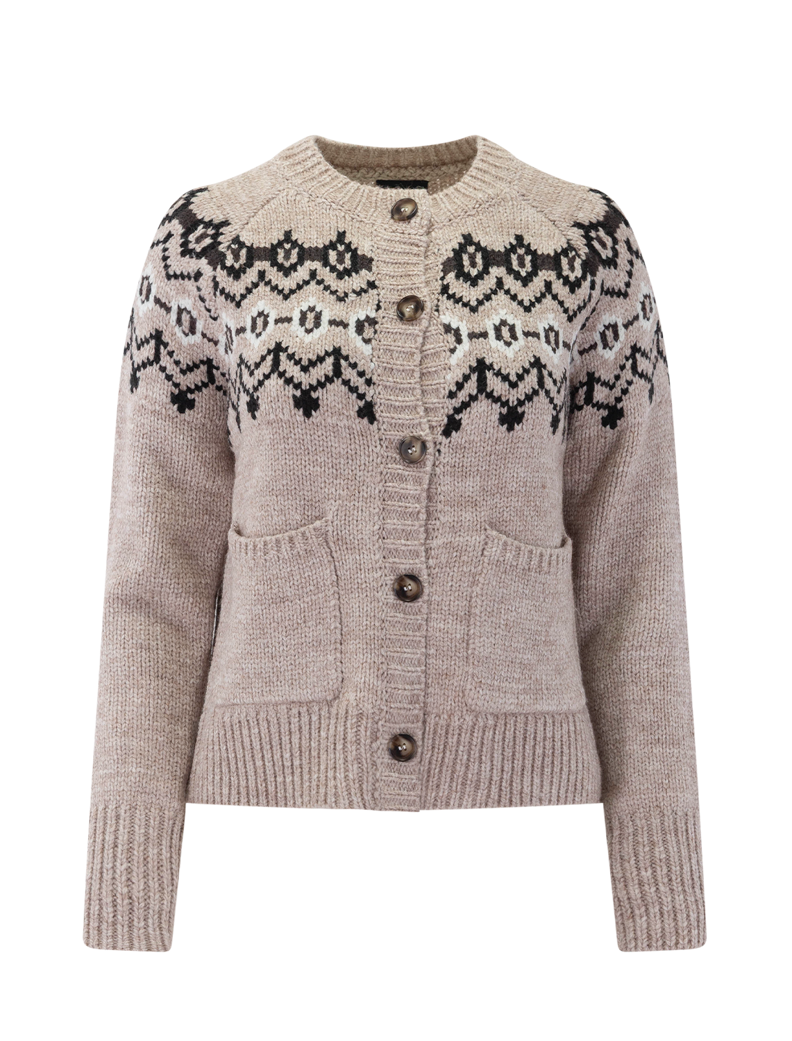 A timeless knit cardigan in classic fair isle pattern, this cardigan brings cozy charms to any outfit. Its round neckline and patch pockets make it as practical as it is stylish.