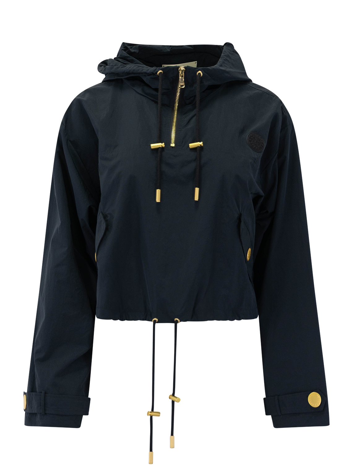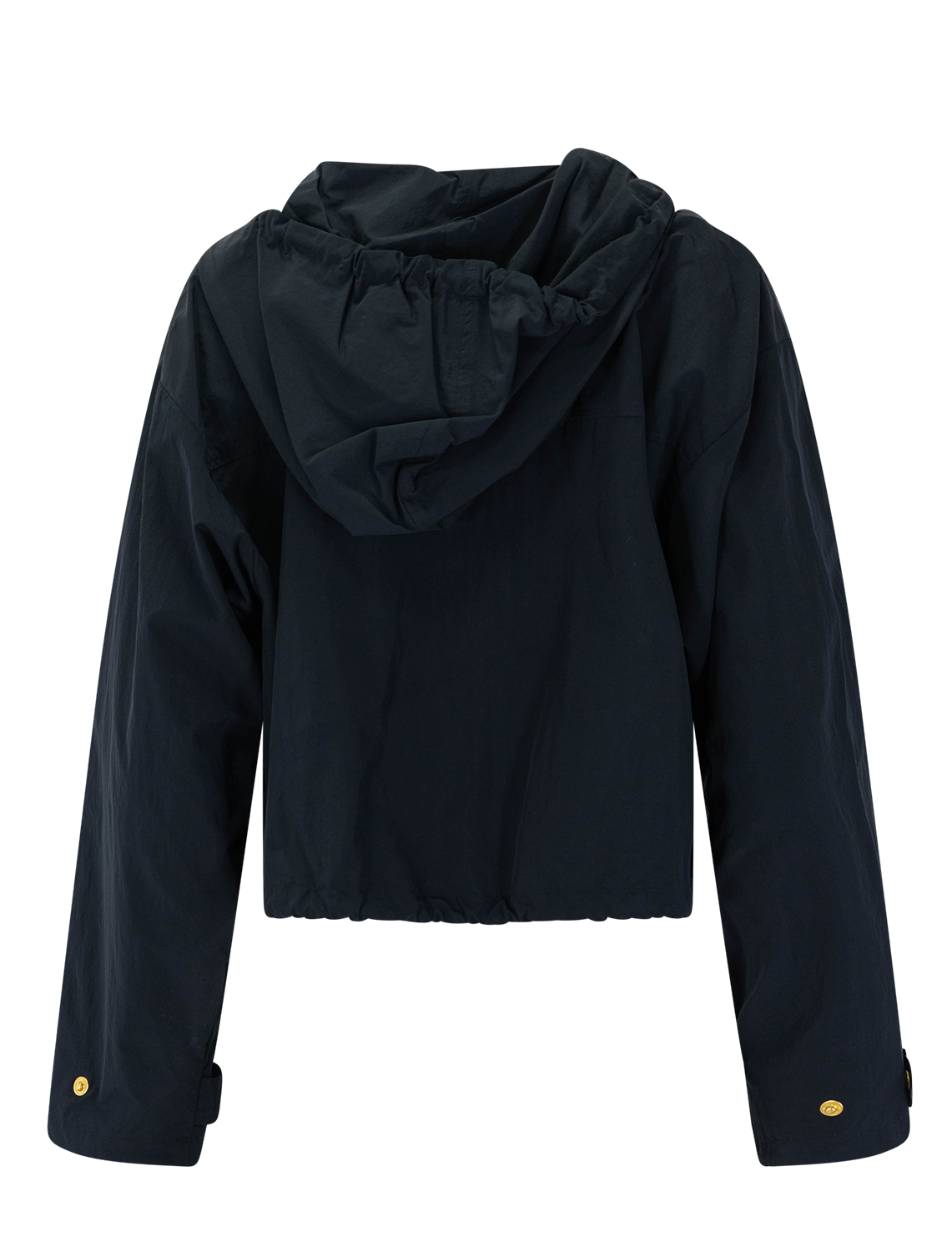 Sporty yet polished, the Bronwyn is an elevated windbreaker for everyday ease. A cropped silhouette, gold snaps, and adjustable drawstrings blend function and style.