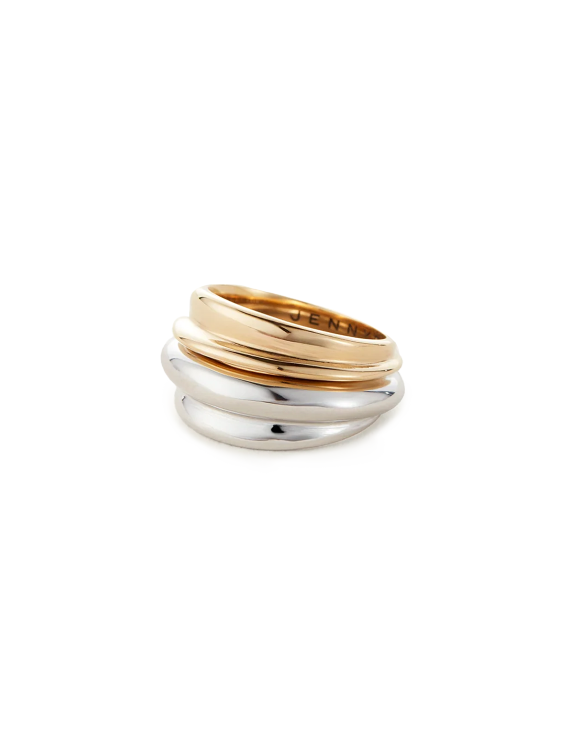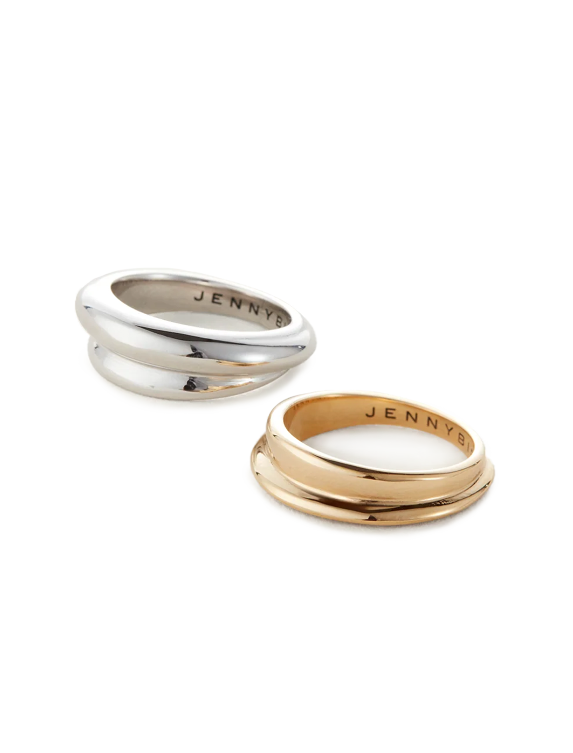 A pair of thin rings boasting deep contours. These are water-resistant, making them the perfect addition to your jewelry box. Finished in high-polish silver and 14k gold.