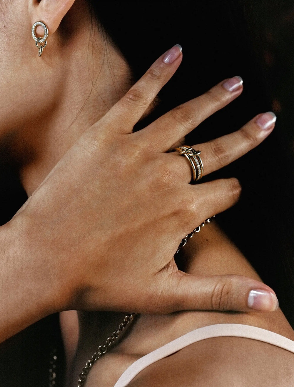 The Sonny ring was forged with simplicity in mind. Its core band of pavé diamonds is framed by two outer bands of solid metal, linked by two matching connectors. The Sonny features thin 1.7mm bands, and is perfect for stacking. Ideally suited for everyday wear. Each Sonny is individually handmade in Los Angeles.