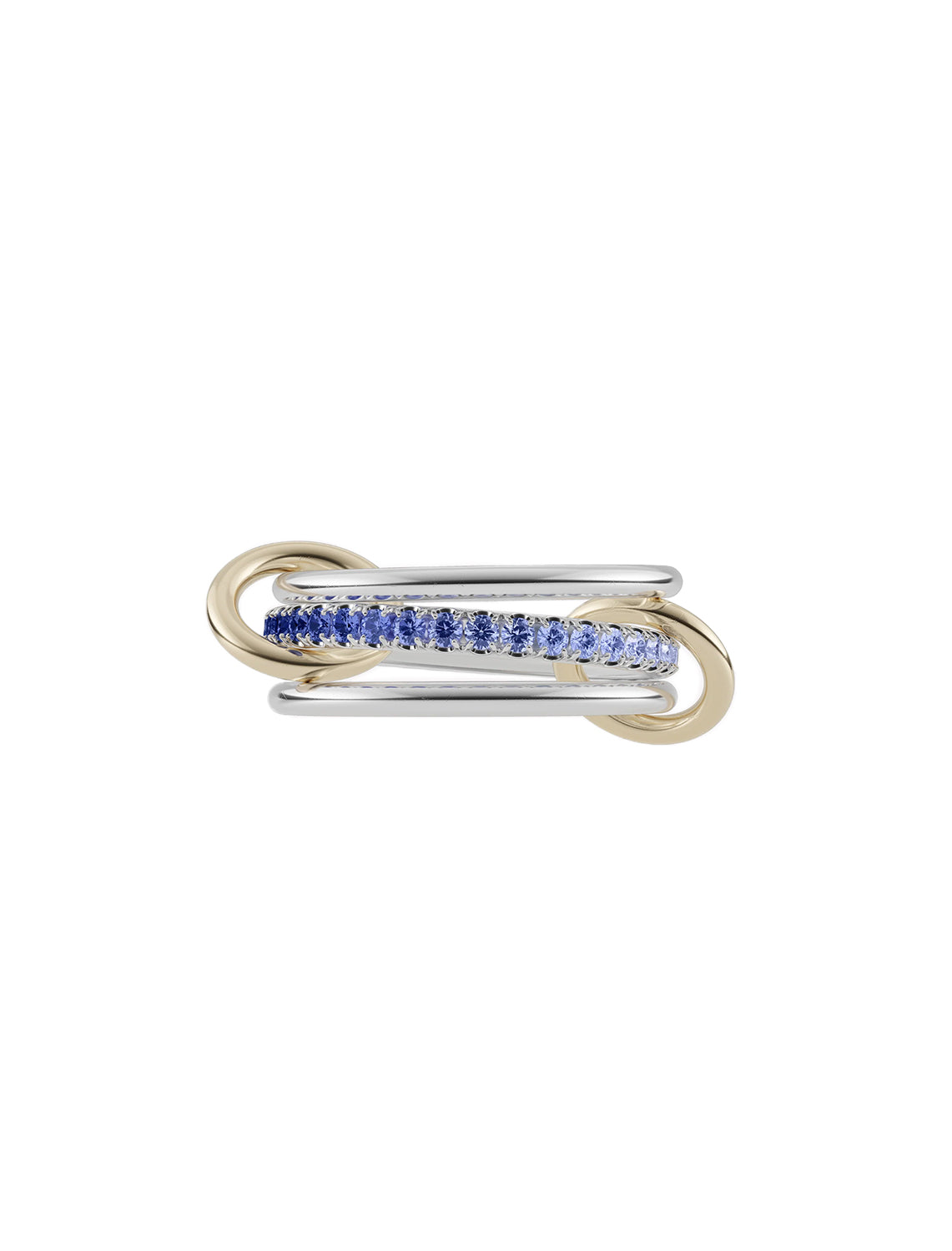The Tigris is expertly crafted with a central band of u-pavé diamonds or ombré sapphires, framed by two equal-gauged bands of .925 sterling silver or 18k yellow gold. All bands are linked by orbiting 18k gold connectors, resulting in an elegant and lightweight complement to any ensemble. Each Tigris is artfully handmade in Los Angeles.
