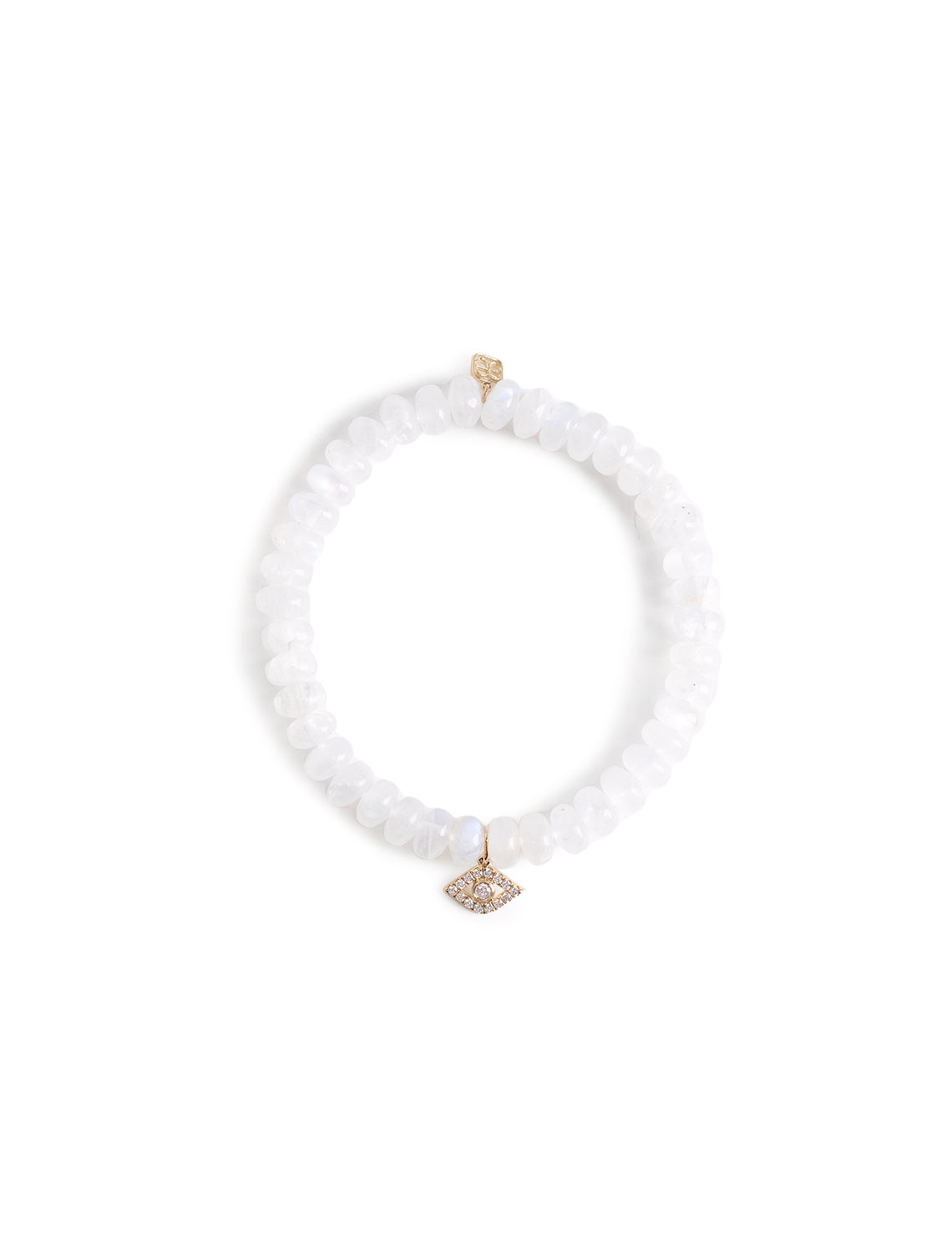 Ward off negative energy with this elegant 14k yellow gold small protective eye charm bracelet, featuring pavé-set diamonds for a sparkling touch. The charm measures approximately 1/8" high by 1/4" wide and is beautifully showcased on smooth rainbow moonstone rondelles.