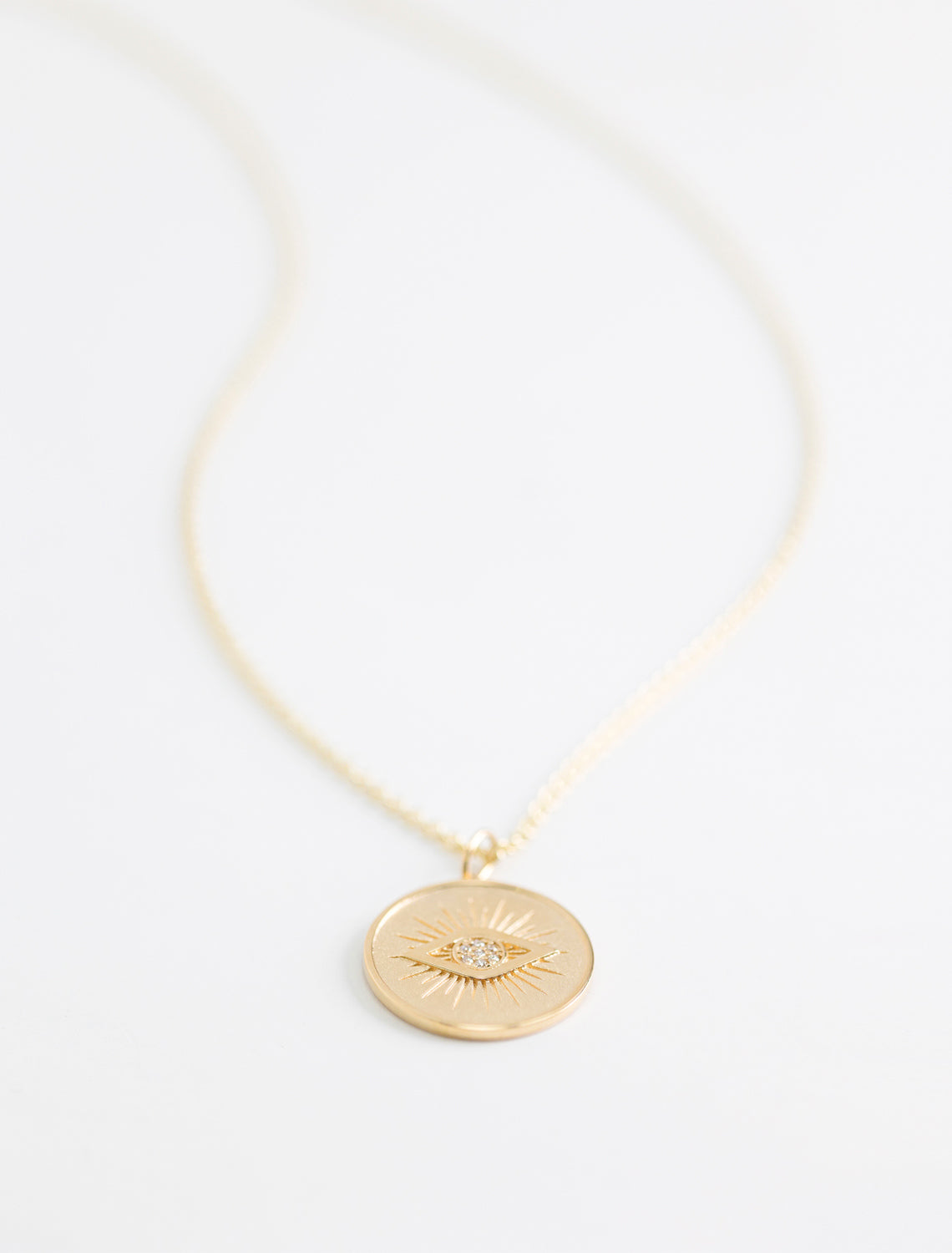 This exquisite 14k yellow gold coin charm features the iconic protective eye, a symbol of protection that has been cherished across cultures for centuries. The protective eye is believed to ward off negativity and envy, bringing peace and strength to the wearer. Sparkling diamonds are delicately set within the design, adding a touch of elegance and refinement.