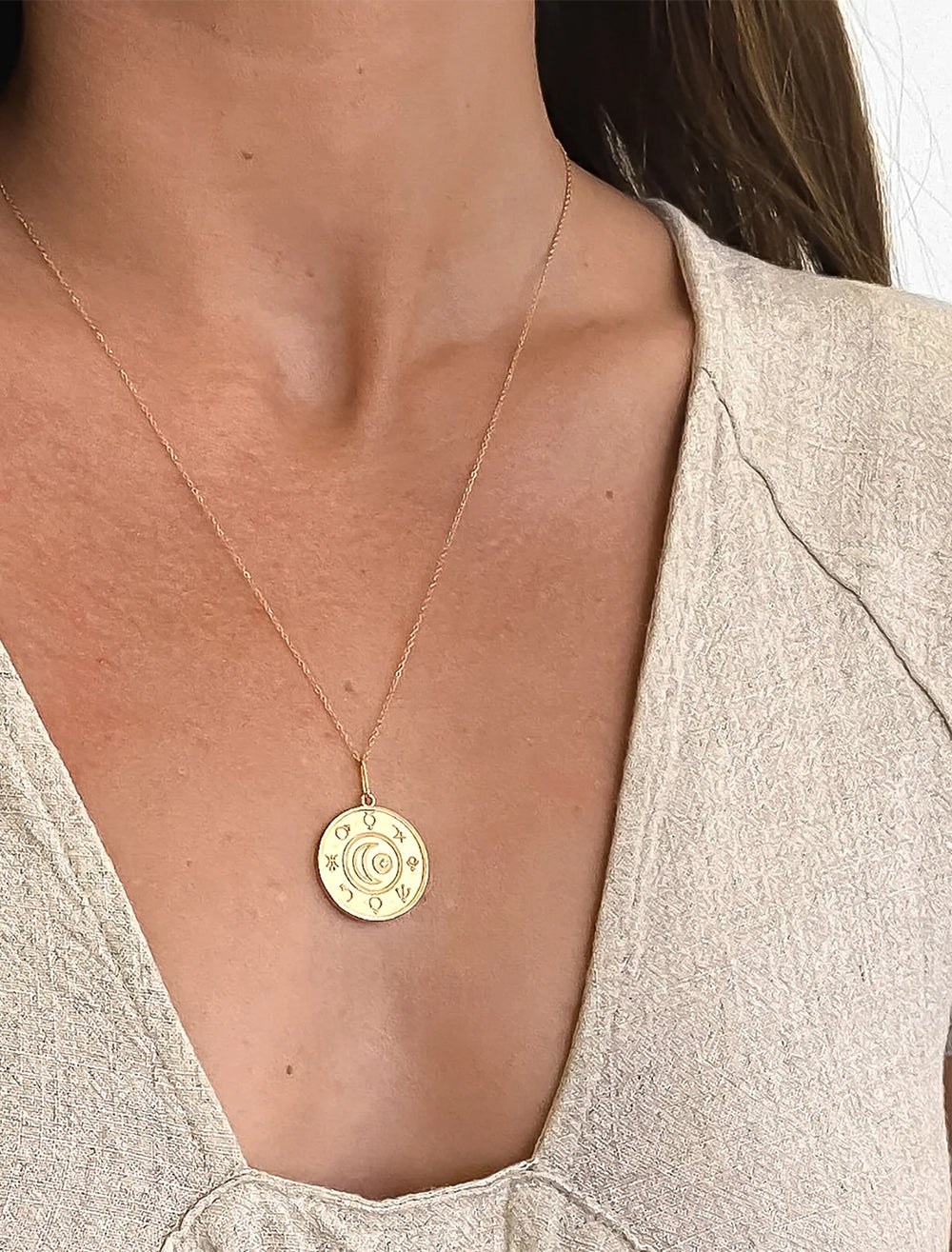 Alchemy is the belief that all areas of life are affected by the powers of the planets. Holding these powers close to us allows a harmonious magic to emerge and brings us to our fullest sense of self. Promote well-being and balance with this 14k gold plated alchemy pendant adorned with planetary symbols, the moon x cubic zirconia sun.