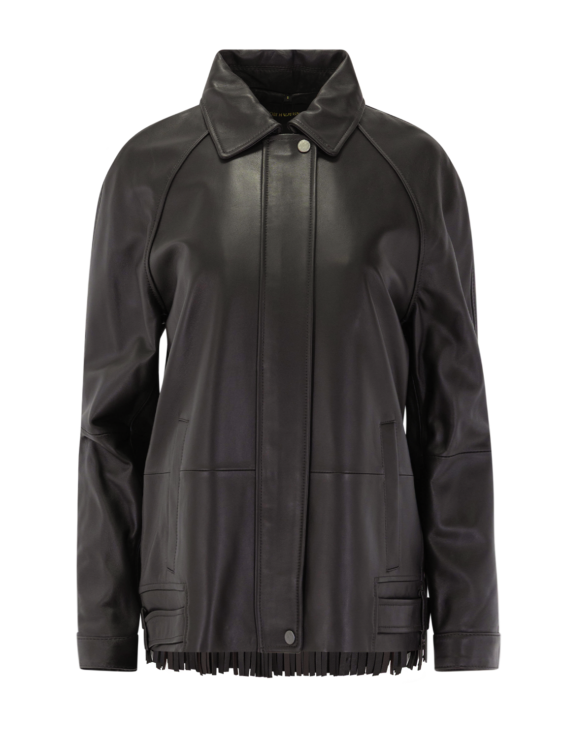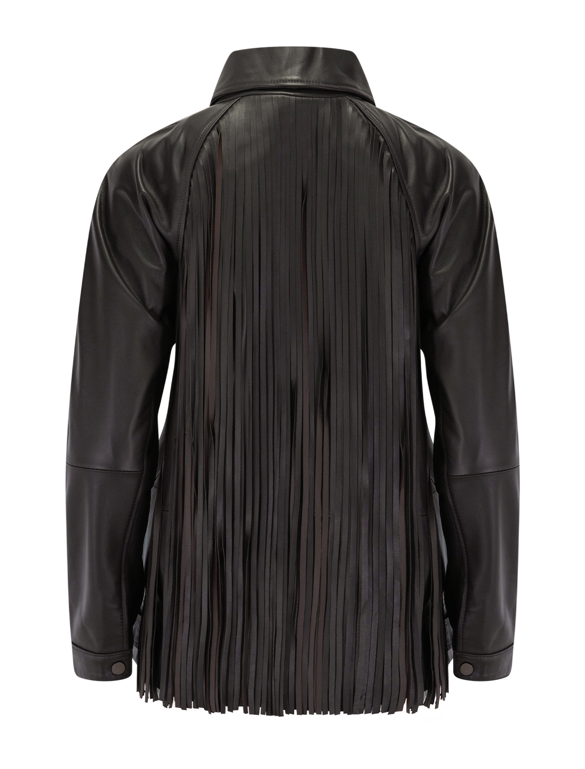 Rendered in supple lambskin leather, the "Drake" jacket from Kobi Halperin features a paneled construction with smooth, clean lines, contrasted with a fluttering fringed back.