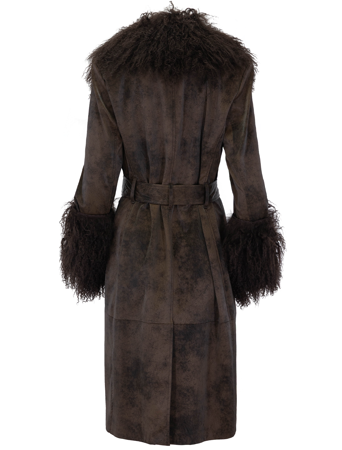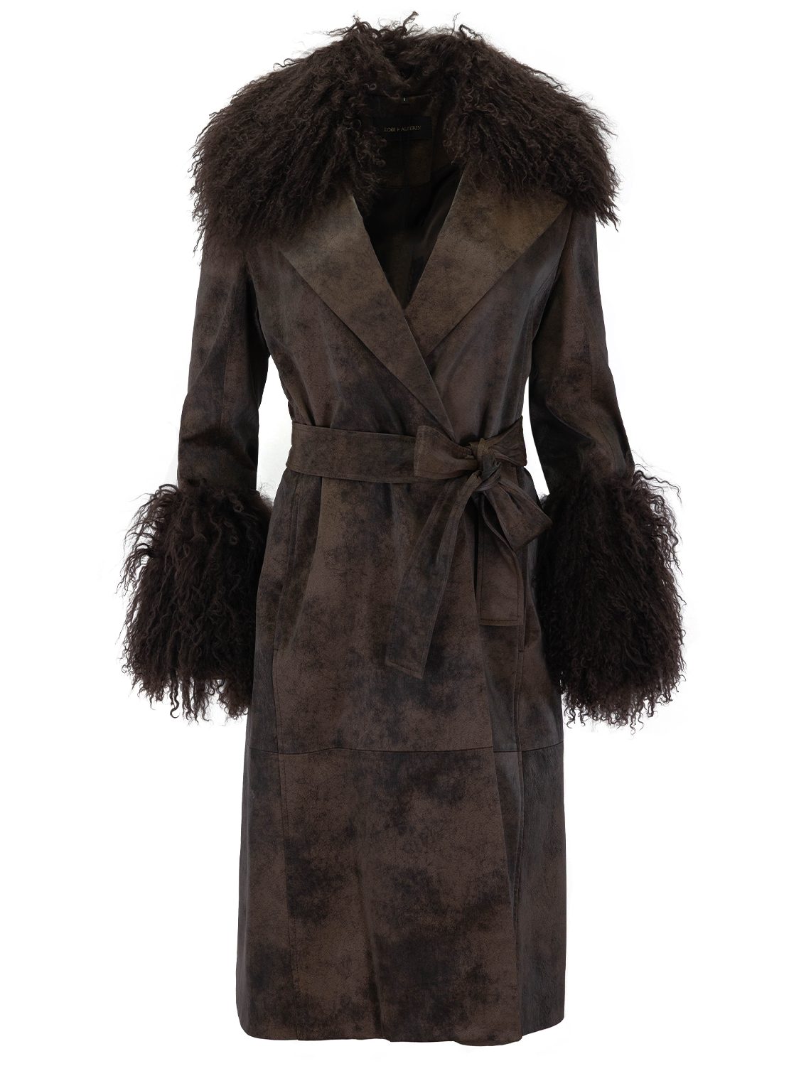 The Viv coat from Kobi Halperin has a long robe-style silhouette and features plush shearling trim.
