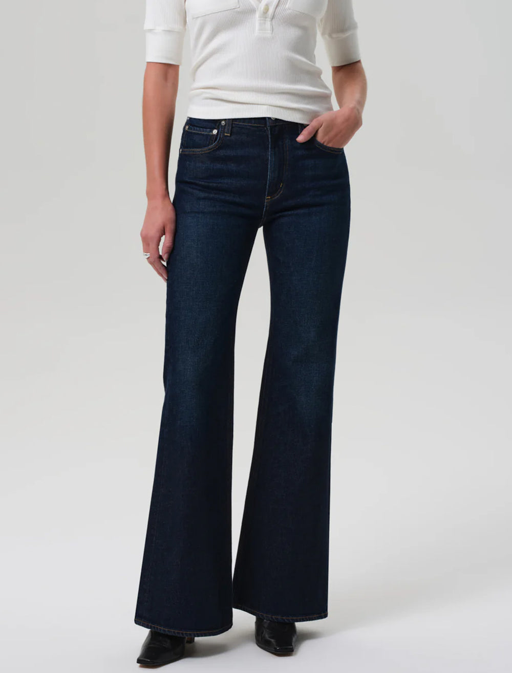 The Kimberly is a high-rise flare inspired by classic '70s silhouettes, designed to elongate the leg and contour the waist. Crafted from comfort stretch denim with a super soft hand, it offers lasting shape and all-day ease. The Madison wash—a dark indigo with soft fading and whiskering—adds a touch of vintage refinement. Style with slim knits or structured shirting for a clean finish.
