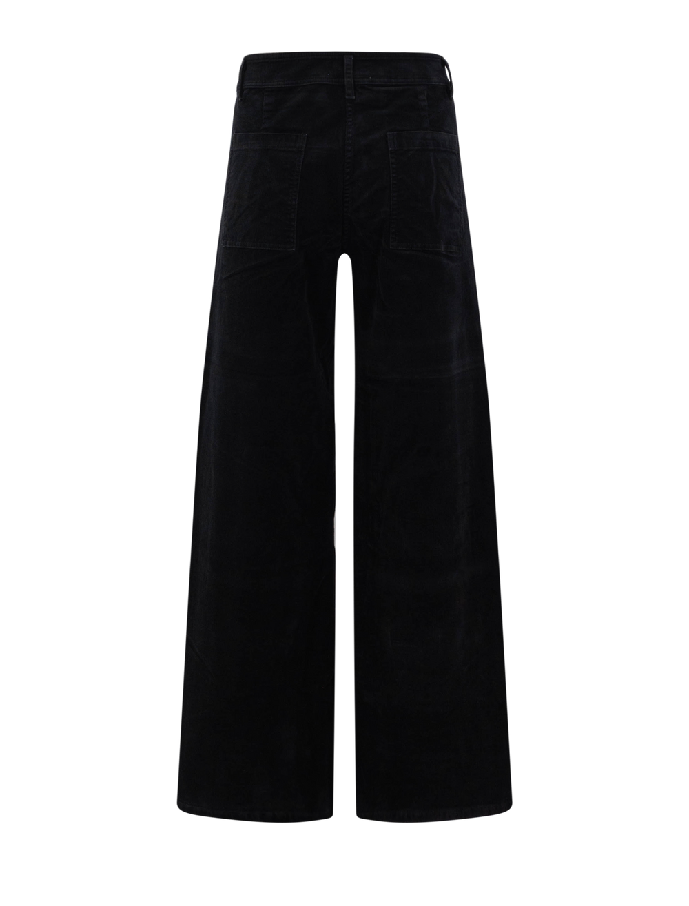 Mid-rise relaxed wide leg pant in soft stretch corduroy. Cropped ankle length. Fitted through waist and hip. Opens to easy leg. Zip fly. Button closure. Back patch pockets. Back darts. Belt loops.