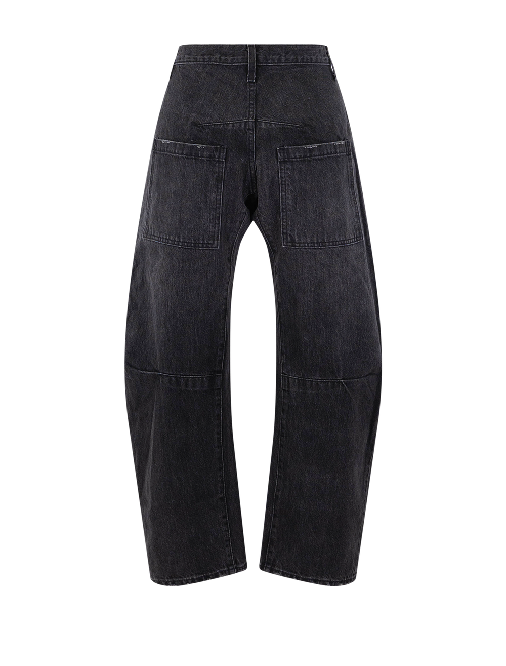 Mid-rise, relaxed fit barrel leg jean. Uniquely curved silhouette. Seam detail at knees. Gusset at inseam. Zip fly. Shank closure. Top-stitched front and back patch pockets. Belt loops.