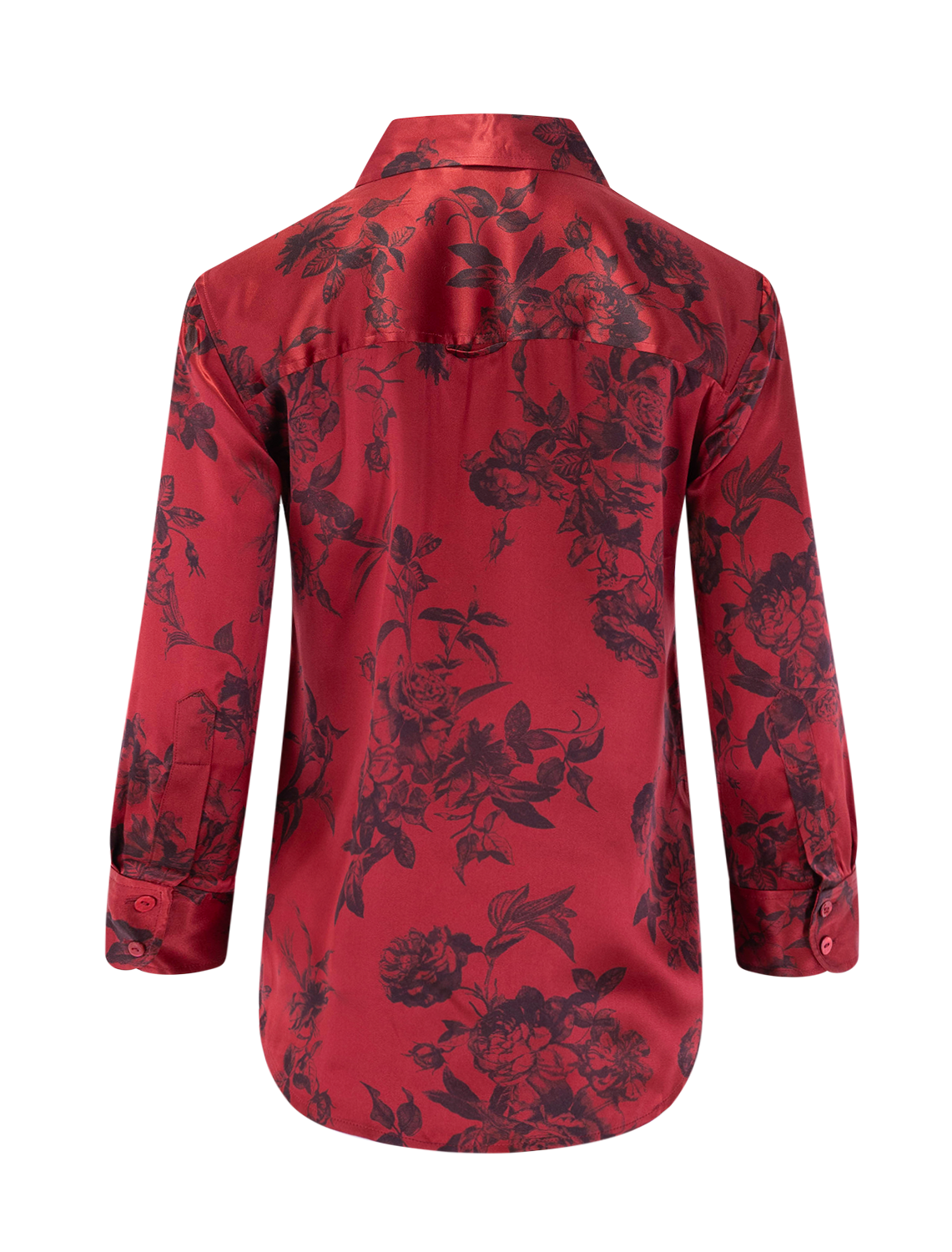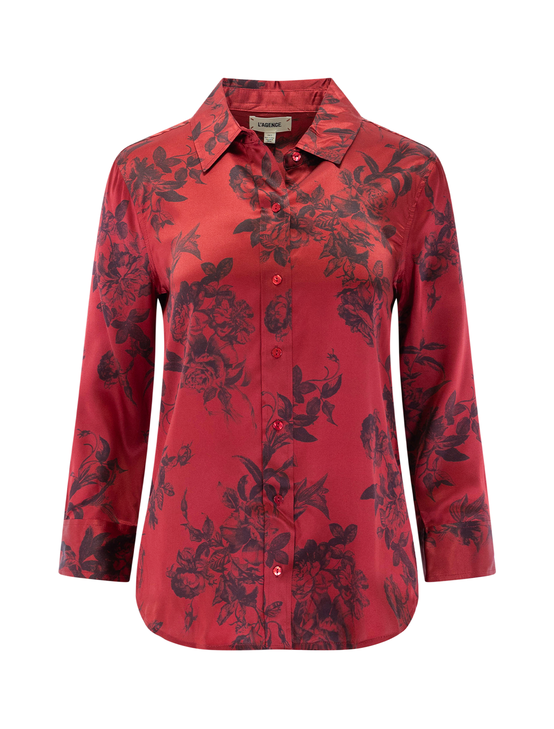 This style was featured in L'Agence's Fall ‘25 NYFW presentation. The Dani is the iconic silk button-down that belongs in every wardrobe. The brand's signature three-quarter sleeve shirt is back in burgundy in an artistic floral print.