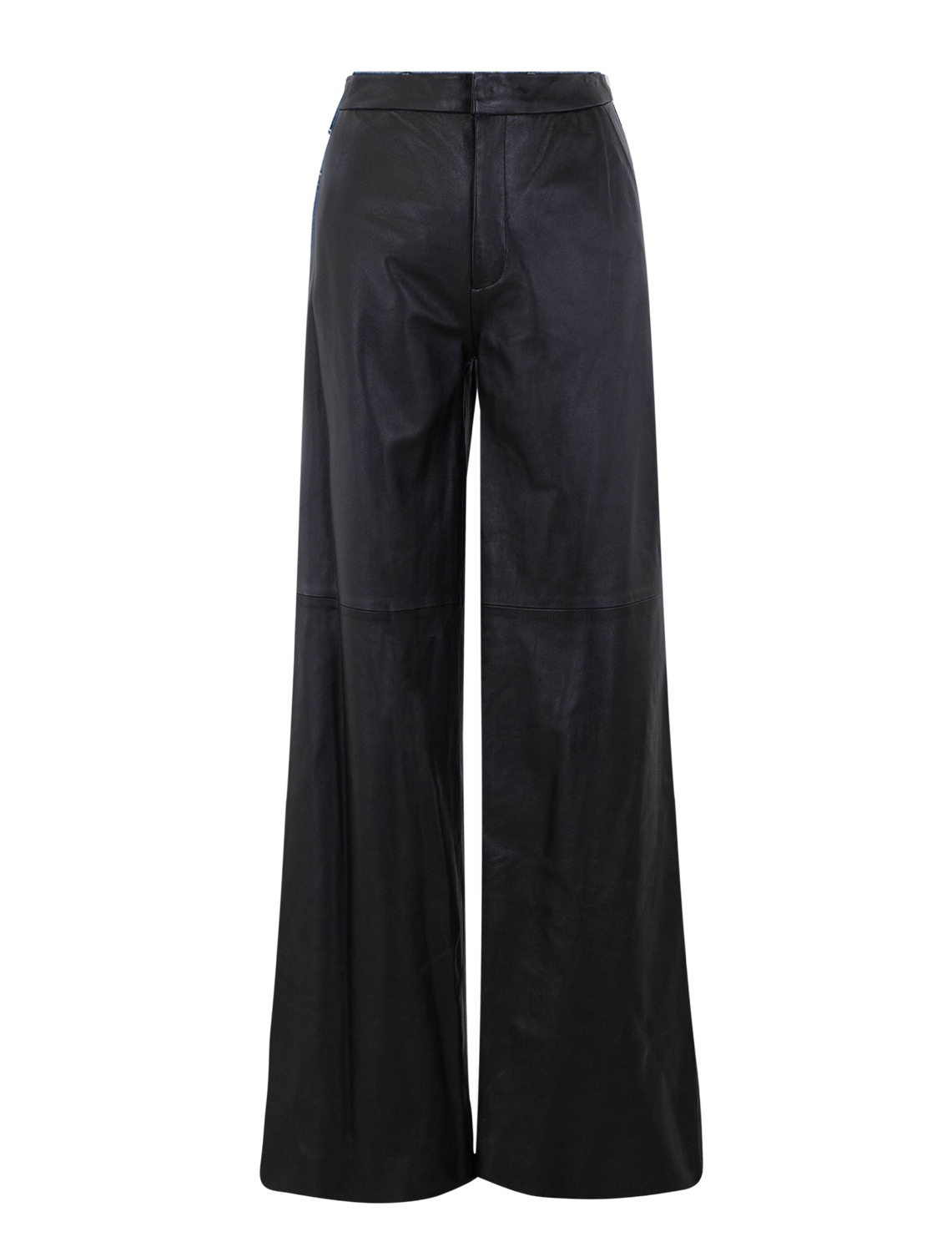 A luxe straight-leg trouser in black lambskin leather. Supple premium-leather hugs from contoured waistband to upper thigh, then releases into a full straight leg. Includes front slant and back welt pockets. With zip fly and hidden hook-and-bar closures. Fully lined. 100% Leather.