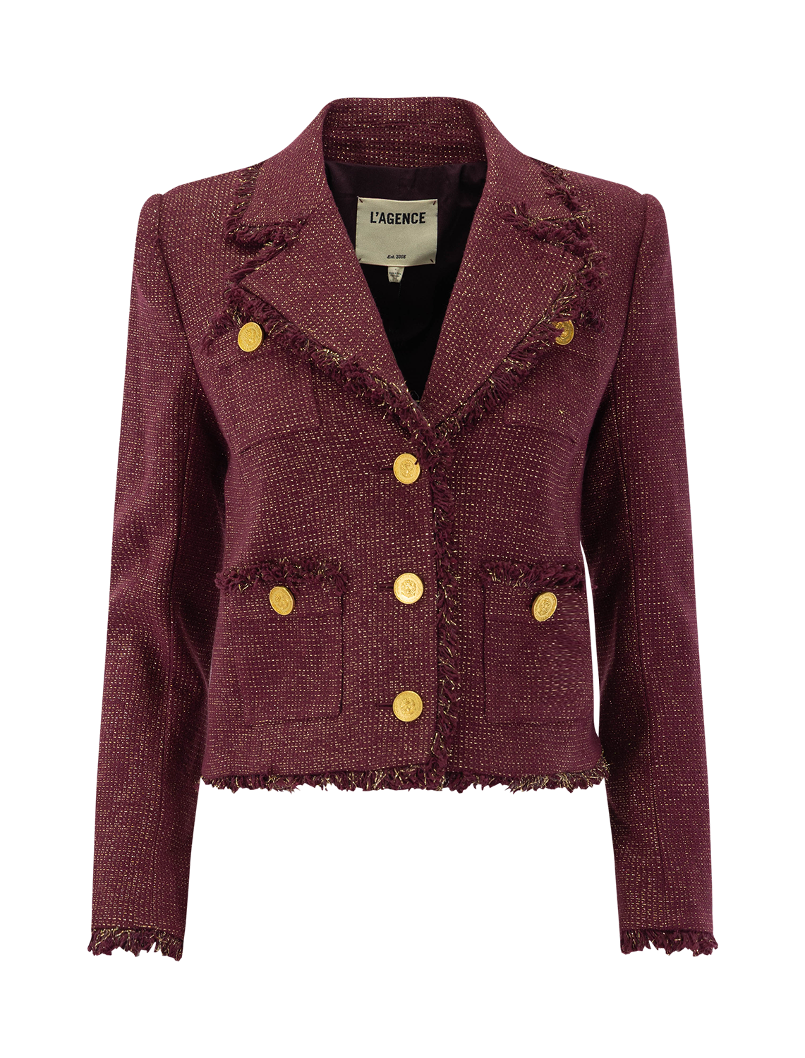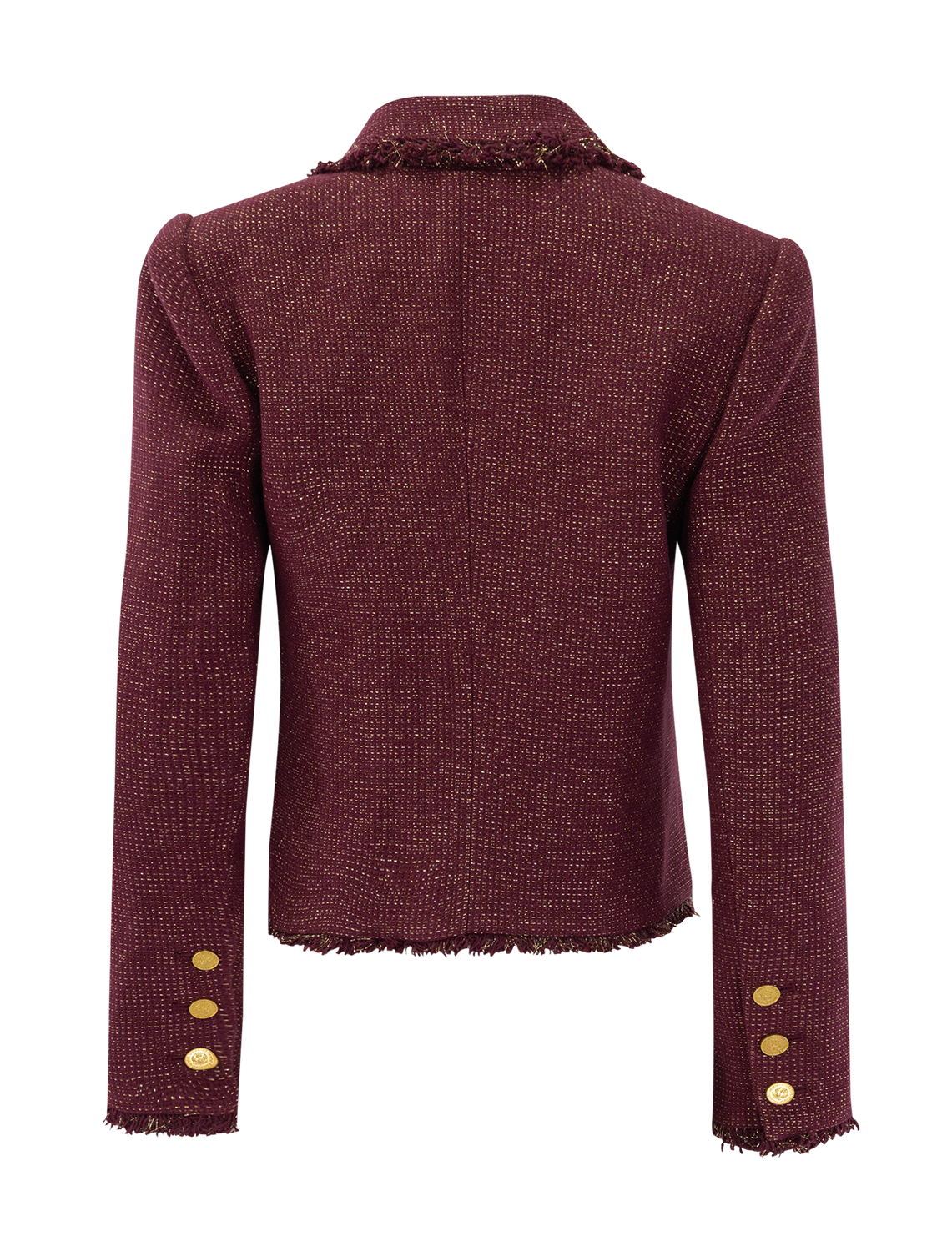 A luxe fabrication meets a classic cut in the collared Sylvia jacket. Fringed trims and embossed gold buttons complete its look. Now in dark malbec with a gold sparkle.