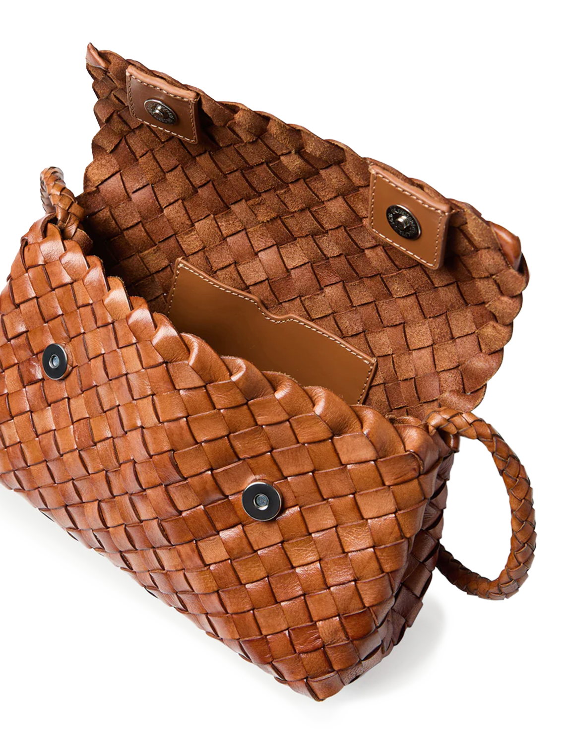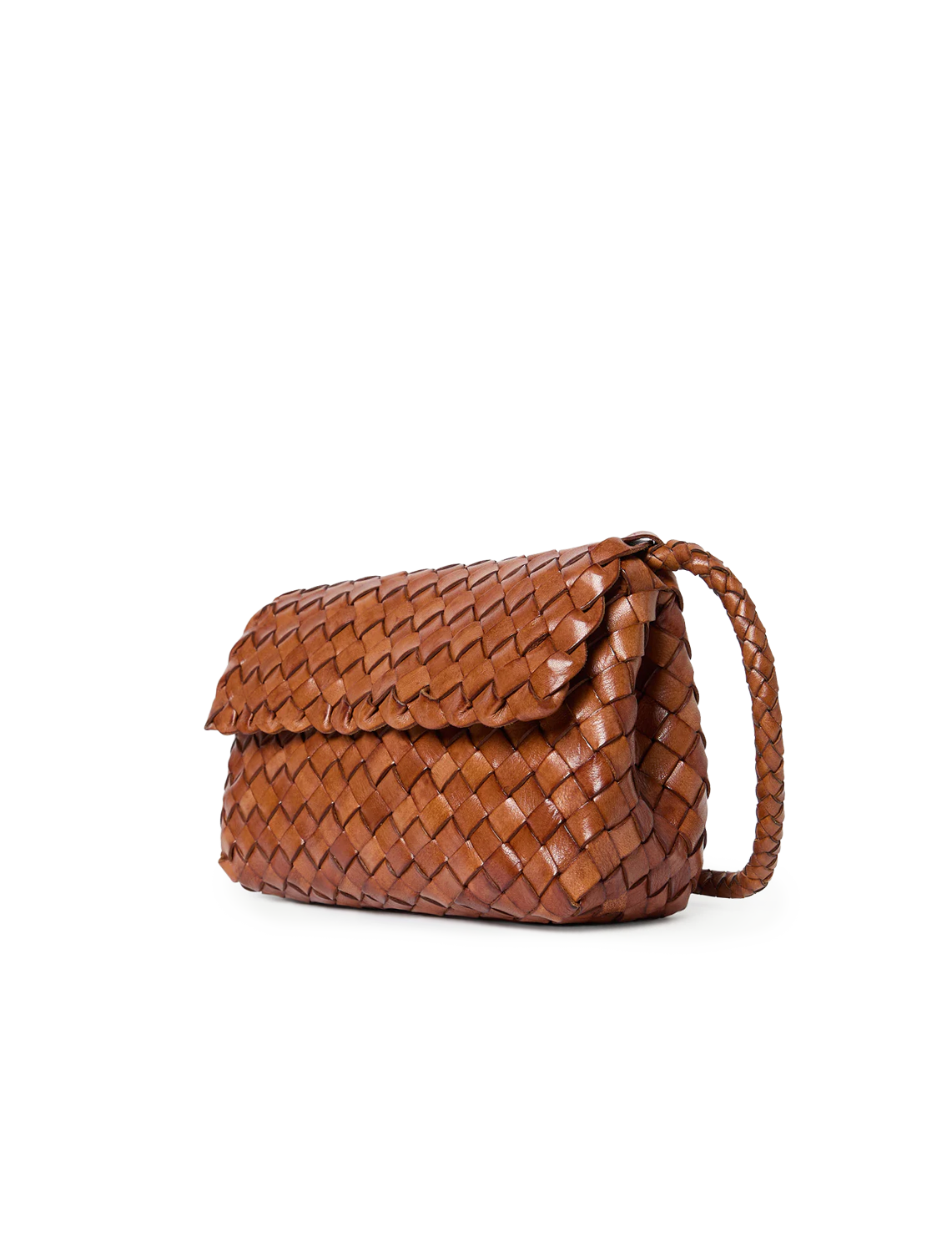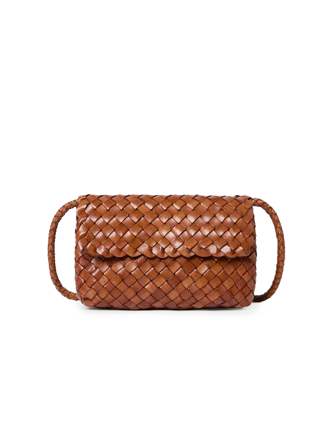 Crossbody bag in timber woven leather. Features a magnetic flap closure, interior card slot, and a blind embossed leather logo patch.