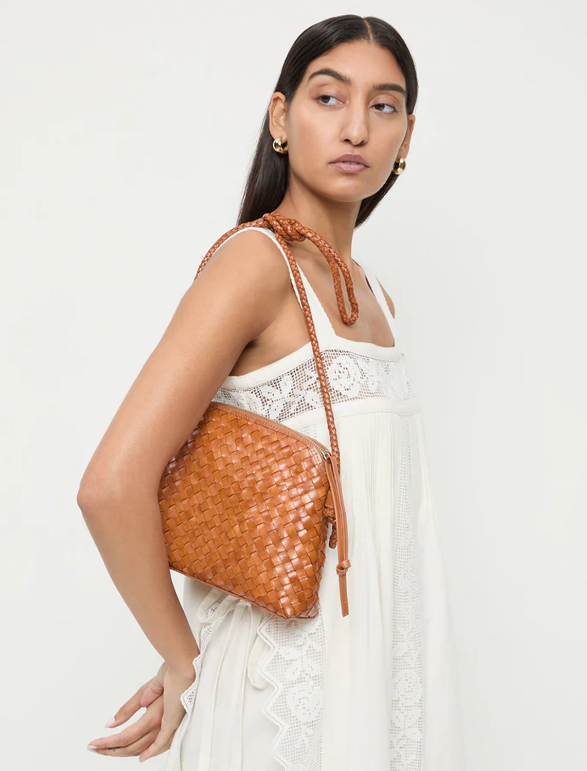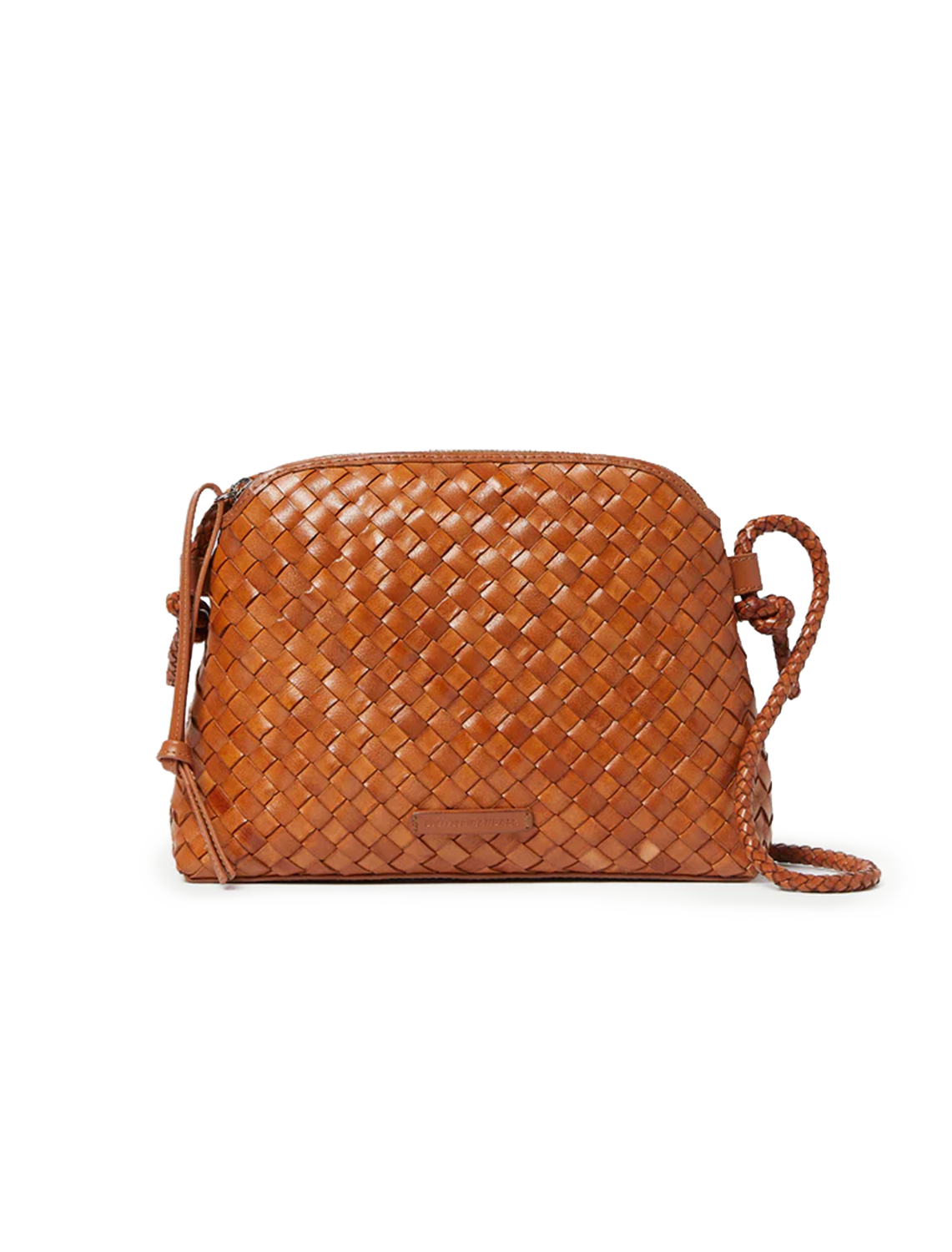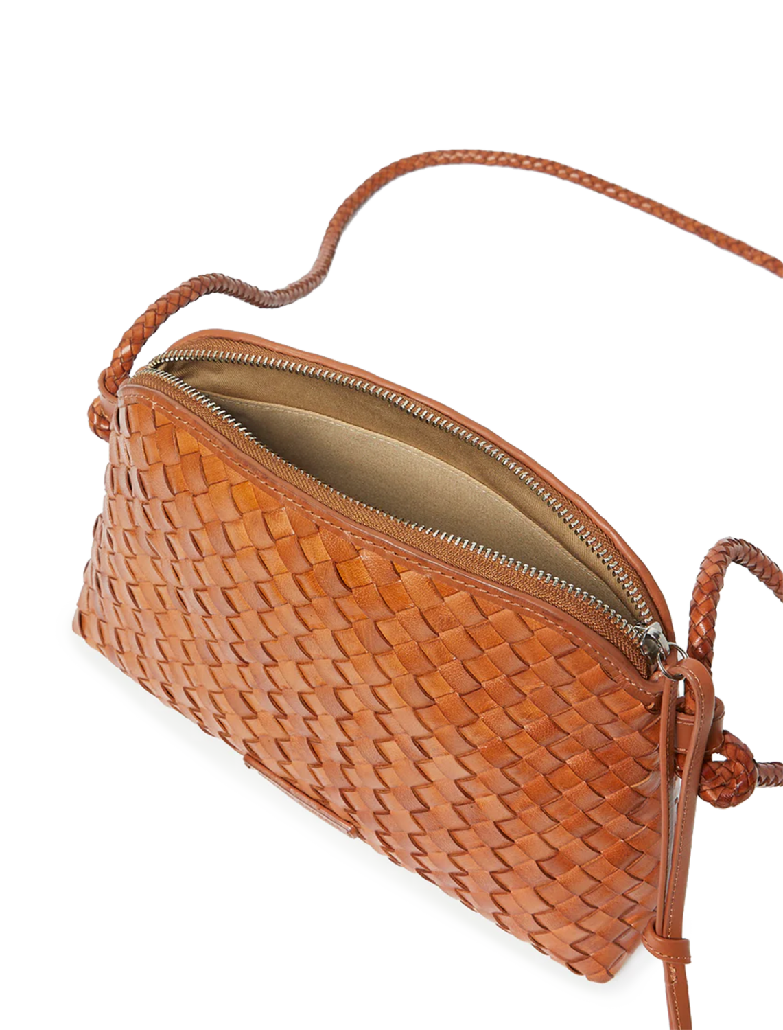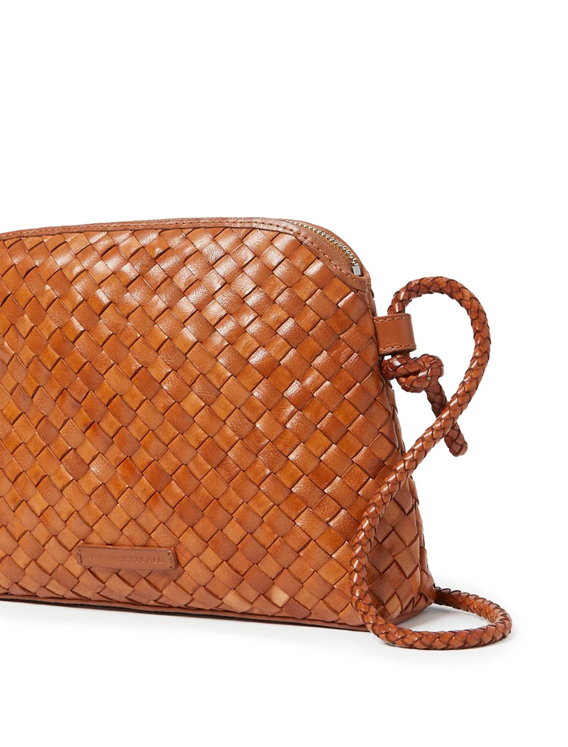 Crossbody bag in timber brown woven leather. Features a zipper closure, cotton lining, interior pocket, and gold stamped logo.