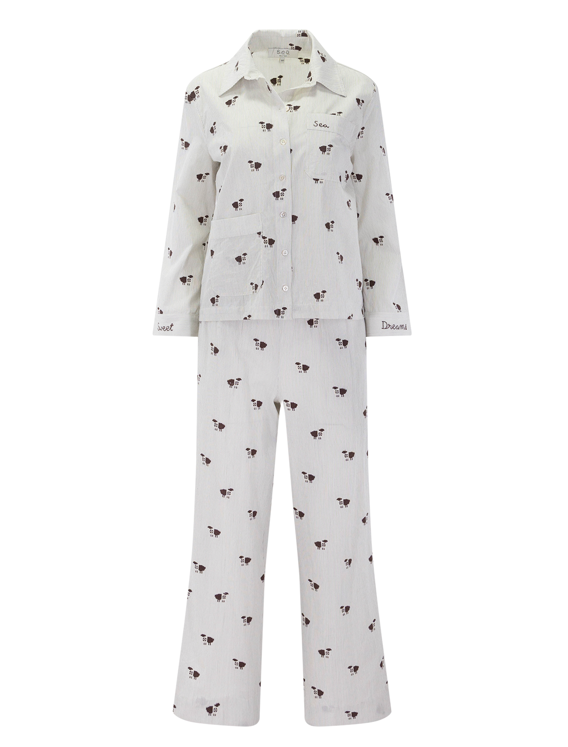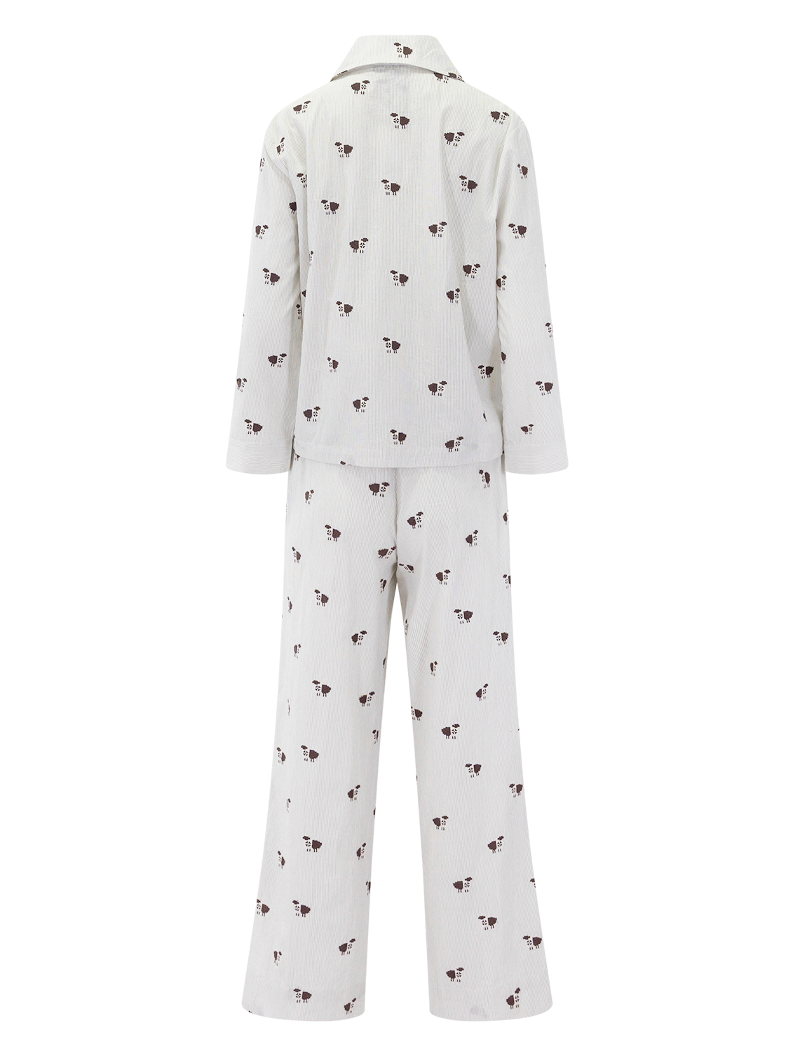 The Ruthie pajama set is crafted from striped fabric, adorned with charming embroidered sheep accents throughout. "Sweet Dreams" embroidery on the cuffs adds a whimsical, playful detail to this sleepwear set.