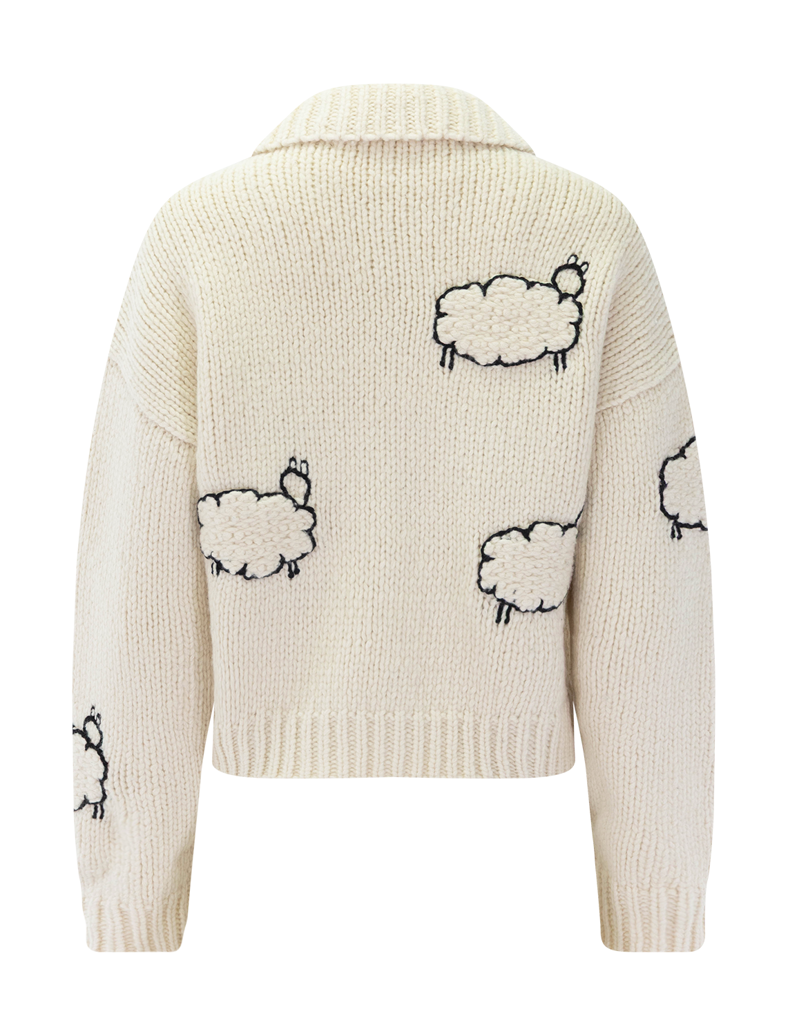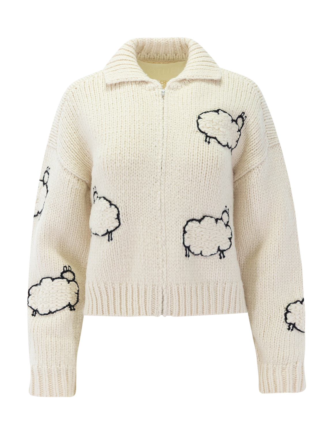 What the flock. A collared cardigan with ribbed hems, a zipper down the front and a cropped fit. Made from a blend of cotton and wool, the sweater is designed in off-white with black sheep silhouettes throughout.