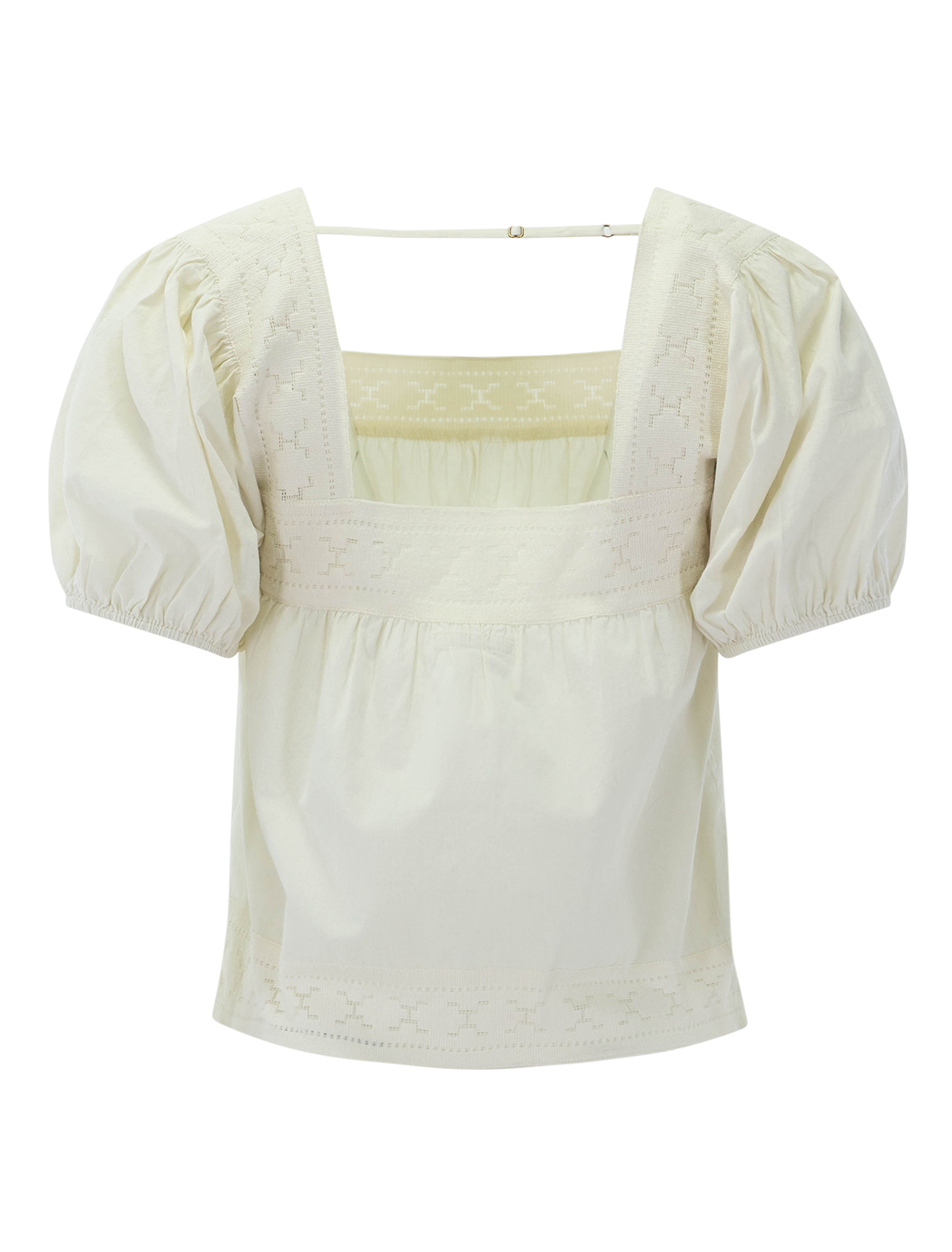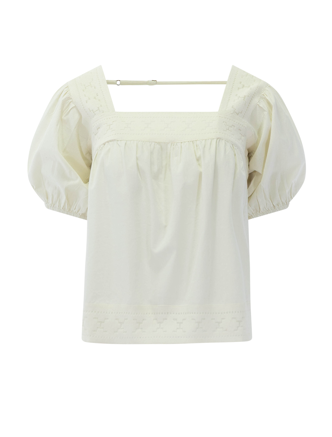 Rise and shine. A square-neck blouse with short puff sleeves and a loose, flowy fit. Made from 100% cotton, Early Bird is an off-white with embroidery along the neckline and hem.