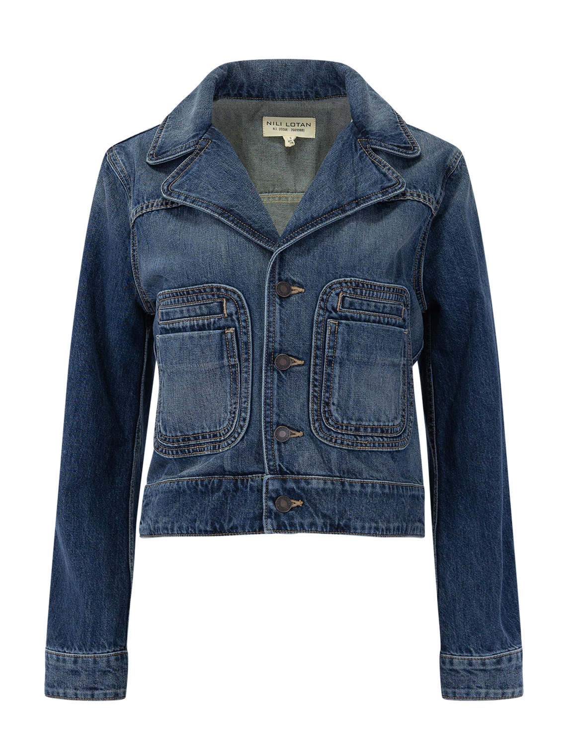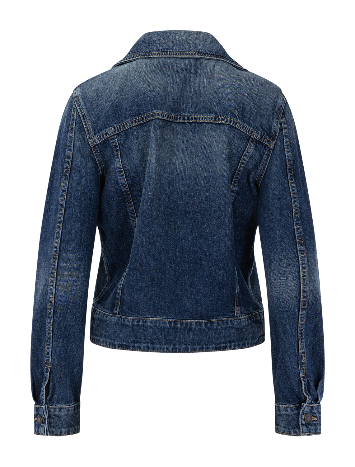 The Georgy Denim Jacket is a short, easy jacket crafted from 100% cotton denim. It features pocket details including a patch pocket with double entry and a besom pocket, a back yoke with double needle stitch, hem back detail, and topstitching throughout.