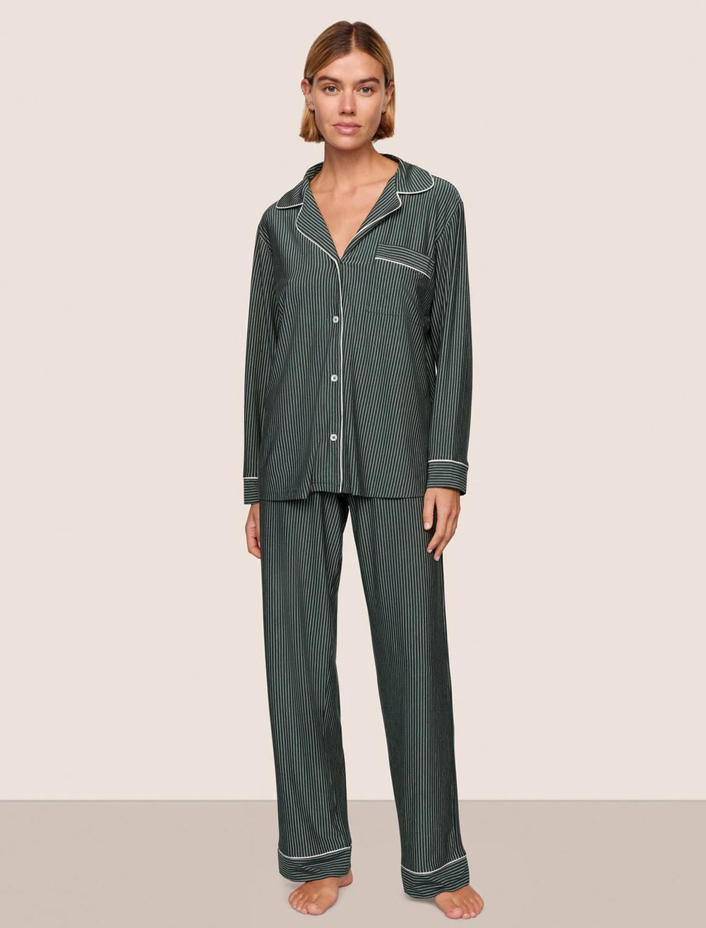 The PJ that started it all. Made from TENCEL™ Modal fibers and a touch of elastane, this buttery soft fabric is verified by OEKO-TEX® Standard 100, meaning it’s dyed with safe and non-toxic dyes. This relaxed long sleeve set features contrast piping, a button-front top with a notch collar and functional pocket, and a low-rise straight leg pant with a thin elastic waistband.